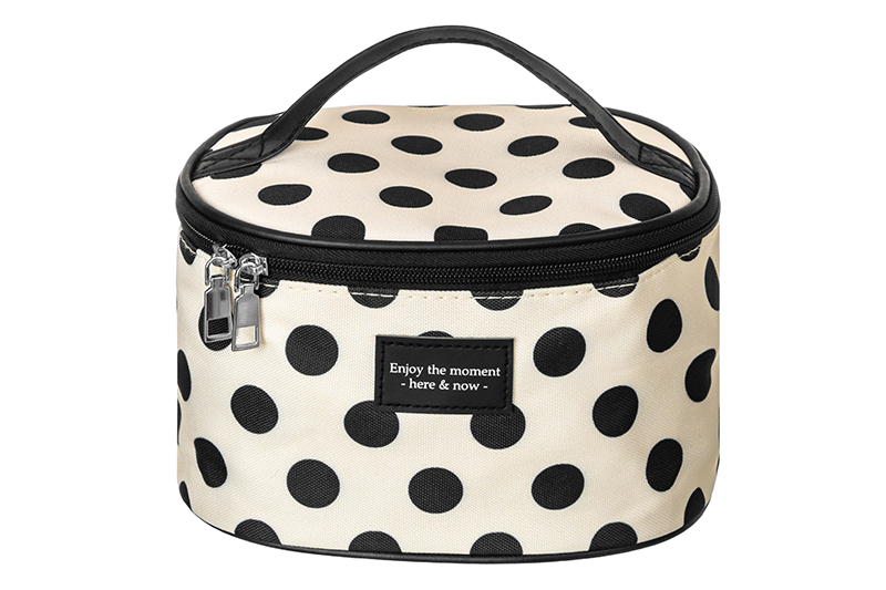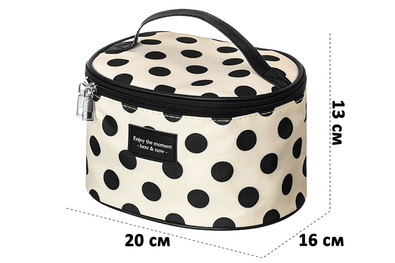 Косметичка-сумочка от ELCASA предназначена для компактного хранения косметики и аксессуаров. Размер изделия – 20х16х13 см. Выполнена из полиэстера с элементами из металла. Оснащена прочной ручкой и замком-молнией с двумя металлическими собачками. Имеет откидную верхнюю часть, оснащённую кармашками и дополнительным креплением. На поверхность изделия нашита надпись «Enjoy the moment – here & now» («Наслаждайтесь моментом – здесь и сейчас»). Красивый мягкий органайзер станет незаменимым дополнением домашнего инвентаря, позволяя удобно хранить даже большую коллекцию косметики! Заполните её палетками теней, баночками с кремами, губными помадами и принадлежностями для маникюра. Разложите аксессуары для волос – резинки, заколки или расчёски. Заполните мелкими предметами одежды – перчатками, шарфиками или носками. Благодаря стильному белому дизайну в чёрный горошек косметичку можно хранить даже на видном месте, например, на полке или вешалке. Она гармонично дополнит любой интерьер! Прочная ручка обеспечит удобство при переноске, поэтому изделие выступит в роли практичной походной сумки. Возьмите её с собой в путешествие или поездку для перевозки разнообразных мелочей. Она послужит в роли дорожной аптечки для удобной транспортировки лекарств. Это не только оригинальный, но и функциональный подарок как для девочки, так и для женщины. Не рекомендуется применять абразивные моющие средства. В коллекции бренда ЭЛЬКАСА вы найдет большой ассортимент товаров для дома, которые помогут вам организовать бережную систему хранения ваших вещей!