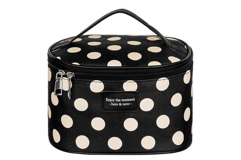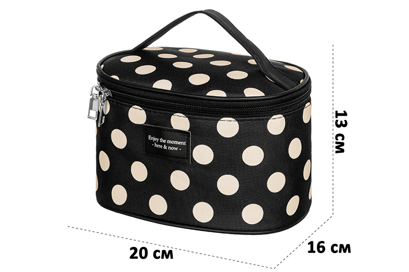 Косметичка-сумочка от ELCASA предназначена для компактного хранения косметики и аксессуаров. Размер изделия – 20х16х13 см. Выполнена из полиэстера с элементами из металла. Оснащена прочной ручкой и замком-молнией с двумя металлическими собачками. Имеет откидную верхнюю часть, оснащённую кармашками и дополнительным креплением. На поверхность изделия нашита надпись «Enjoy the moment – here & now» («Наслаждайтесь моментом – здесь и сейчас»). Красивый мягкий органайзер станет незаменимым дополнением домашнего инвентаря, позволяя удобно хранить даже большую коллекцию косметики! Заполните её палетками теней, баночками с кремами, губными помадами и принадлежностями для маникюра. Разложите аксессуары для волос – резинки, заколки или расчёски. Заполните мелкими предметами одежды – перчатками, шарфиками или носками. Благодаря стильному чёрному дизайну в белый горошек косметичку можно хранить даже на видном месте, например, на полке или вешалке. Она гармонично дополнит любой интерьер! Прочная ручка обеспечит удобство при переноске, поэтому изделие выступит в роли практичной походной сумки. Возьмите её с собой в путешествие или поездку для перевозки разнообразных мелочей. Она послужит в роли дорожной аптечки для удобной транспортировки лекарств. Это не только оригинальный, но и функциональный подарок как для девочки, так и для женщины. Не рекомендуется применять абразивные моющие средства. В коллекции бренда ЭЛЬКАСА вы найдет большой ассортимент товаров для дома, которые помогут вам организовать бережную систему хранения ваших вещей!