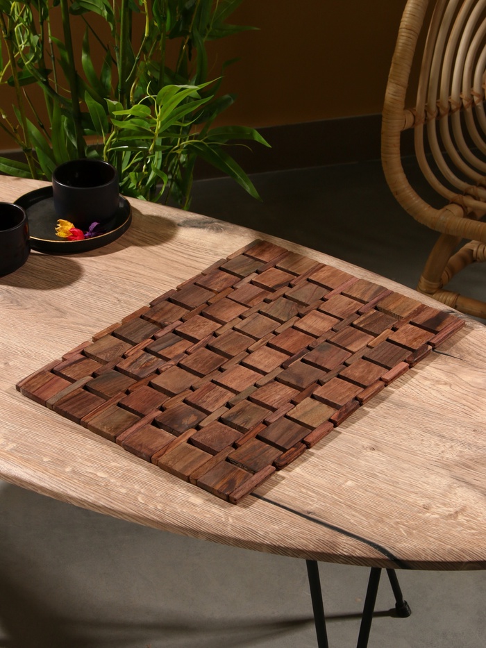 Коврик из тикового дерева, размером 40×30 см и толщиной 0.7 см, выполненный в благородном коричневом цвете. Изготовлен из натурального дерева, этот прямоугольный коврик отличается плетеной фактурой, добавляющей вашему дому нотки изящества и уникальности.