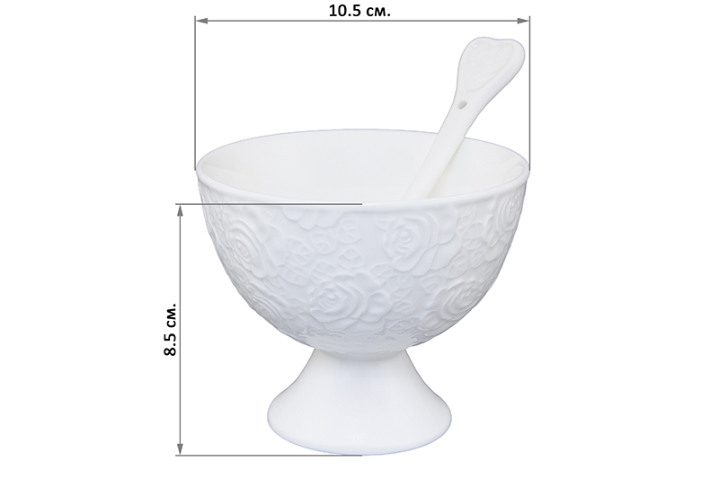 Креманка из серии «Белые розы» с ложкой выполнена из высококачественного фарфора. Креманка идеально подходит для сервировки мороженого и любых других десертов. Изящный рельефный рисунок по бортам креманки добавит вашему десерту легкости, а красивая ложка дополнит ансамбль. В серии фарфоровой посуды с использованием бамбука представлен широкий ассортимент товаров для сервировки стола, которые несомненно впишутся в любой интерьер благодаря лаконичному дизайну, натуральным материалам и высокой функциональности. Такому подарку будет рада любая хозяйка!