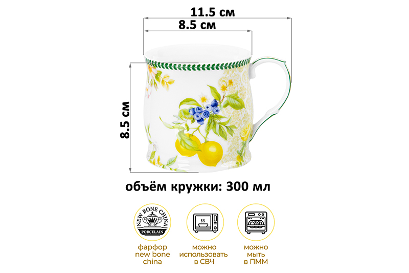 Кружка из серии «Лимоны» от Elan Gallery предназначена для эстетичной сервировки вашего стола. Размер ёмкости – 11,5х8,5х8,5 см, объём – 300 мл. Выполнена из фарфора нового поколения new bone china, сочетающего в себе изящность и высокую прочность. Такие изделия легко отмываются, поэтому сохраняют привлекательный вид и практичны в использовании. Плотная структура материала позволяет посуде дольше сохранять температуру блюд и напитков. От других видов костяного фарфора new bone china отличается большей экологичностью в производстве. Фарфоровая посуда с ярким рисунком в виде лимонов станет изящным дополнением интерьера любой кухни или столовой. Кофейная кружка поможет провести множество приятных завтраков с капучино и латте, а также уютные чайные вечера с конфетами, вафлями, другими десертами и сладостями. Подойдёт ценителям чая и кофе, которые любят пить из красивой и необычной посуды. Согрейтесь зимой любимым напитком: какао с маршмэллоу, ягодным чаем или горячим шоколадом. Летом освежитесь домашним лимонадом или морсом. Не рекомендуется применять абразивные моющие средства. Подходит для использования в посудомоечной машине и микроволновой печи. Поставляется в дизайнерской картонной коробке – благодаря ей вам не потребуется дополнительная подарочная упаковка. Фарфоровая сервировочная посуда будет оригинальным подарком для хозяйки, ценящей не только практичность, но и привлекательность. Серия «Лимоны» от бренда Элан Галерея станет украшением любого кухонного инвентаря и позволит собрать красивый сервиз в едином стиле!