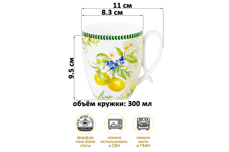 Кружка Elan Gallery "Лимоны" размером 11х8,3х9,5 см и объёмом 300 мл выполнена из фарфора нового поколения new bone china. New bone china сочетает в себе изящность и высокую прочность. От классического костяного фарфора материал отличается большей экологичностью в производстве. Серия "Лимоны" украшена ярким принтом с сочными лимонами, синими ягодками и нежными цветочками. В коллекции вы найдёте любые принадлежности для эстетичной сервировки. Кружечка подходит ценителям чая и кофе, которые любят пить из красивой и необычной посуды. Это отличный вариант для того, чтобы согреться горячим какао зимой и освежиться прохладным лимонадом летом. Интересный бокал с фигурной ручкой в форме петельки украсит ваш стол своим стильным дизайном как на праздник, так и в будни. Пейте молоко или кефир и наслаждайтесь красивой картинкой! В офисе станет незаменимым предметом для чаепития или перерыва на капучино и латте. Белая посуда из фарфора с цветным рисунком станет украшением интерьера вашей кухни и добавит ему нотки тепла и гармонии. В отличие от керамики она не впитывает цвет и запах напитка, легко отмывается и сохраняет свой привлекательный вид долгие годы. Не рекомендуется применять абразивные моющие средства. Можно использовать в микроволновой печи и мыть в посудомоечной машине. Поставляется в красочной картонной коробке. Фарфоровая посуда – хороший подарок женщине или девушке на любой праздник. Благодаря стильной коробочке вам не понадобится дополнительная подарочная упаковка! Наслаждайтесь любимыми напитками из этой кружечки сами, либо сделайте сюрприз своим близким! Серия "Лимоны" позволит собрать чайный или кофейный сервиз в едином стиле и станет украшением вашего дома.