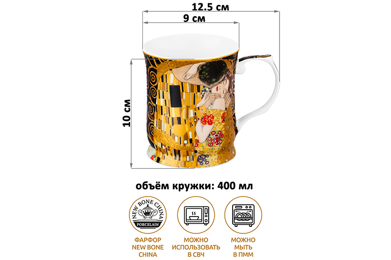 Кружка из серии «Поцелуй» от Elan Gallery предназначена для эстетичной сервировки вашего стола. Размер ёмкости – 12,5х9х10 см, объём – 400 мл. Выполнена из фарфора нового поколения new bone china, сочетающего в себе изящность и высокую прочность. За счёт гладкости изделия легко отмываются, поэтому долго сохраняют привлекательный вид и практичны в использовании. Плотная структура материала позволяет посуде дольше сохранять температуру блюд и напитков. От других видов костяного фарфора new bone china отличается большей экологичностью в производстве. Чашка украшена роскошной репродукцией картины художника Густава Климта. В коллекции можно найти много красивой посуды и предметов декора с изображениями по мотивам шедевров мировой живописи! Кофейная кружка поможет провести множество приятных завтраков с капучино и латте, а также уютные чайные вечера с конфетами, вафлями, другими десертами и сладостями. Подойдёт ценителям чая и кофе, которые любят пить из красивой и необычной посуды. Согрейтесь зимой любимым горячим напитком: какао с маршмэллоу, ягодным чаем, горячим шоколадом. Летом освежитесь домашним лимонадом или морсом. Декоративная кружечка добавит эстетики любому чаепитию. Не рекомендуется применять абразивные моющие средства. Подходит для использования в микроволновой печи и посудомоечной машине. Поставляется в стильной картонной коробке – благодаря ей вам не потребуется дополнительная подарочная упаковка. Фарфоровая сервировочная посуда послужит оригинальным подарком для хозяйки, ценящей не только практичность, но и привлекательность. Серия «Поцелуй» от бренда Элан Галерея станет украшением любого кухонного инвентаря и позволит собрать сервиз в едином стиле!