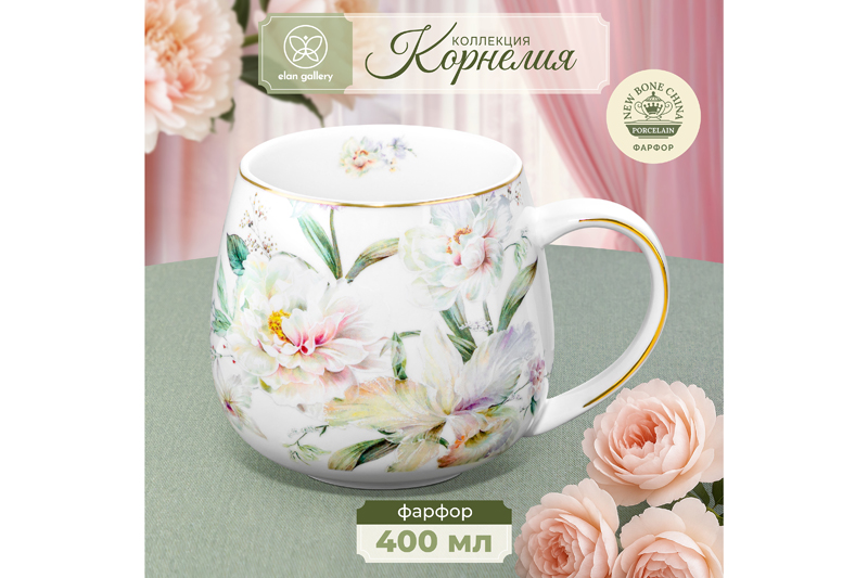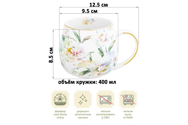 Кружка в форме бочонка из серии "Корнелия" от Elan Gallery предназначена для эстетичной сервировки вашего стола. Размер – 12,5х9,5х8,5 см, объём – 400 мл. Изготовлена из фарфора нового поколения new bone china, сочетающего в себе изящность и высокую прочность. За счёт гладкости изделие легко отмывается, поэтому сохраняет привлекательный внешний вид и практично в использовании. Плотная структура материала позволяет чашкам дольше сохранять температуру напитков. От костяного фарфора new bone china отличается большей экологичностью в производстве. Поверхность изделия овивают обворожительные белые пионы. Они выполнены в манере, вдохновлённой акварельным рисунком. Тонкая золотистая окантовка служит деликатным акцентом и подчёркивает изысканность. Декоративная кружечка поможет провести множество приятных завтраков с капучино и латте, а также уютные чайные вечера с конфетами, вафлями, другими десертами и сладостями. Подойдёт ценителям чая и кофе, которые любят пить из красивой и необычной посуды. Согрейтесь зимой любимым напитком: какао с маршмеллоу, ягодным чаем или горячим шоколадом. Летом освежитесь домашним лимонадом или морсом. Не рекомендуется применять абразивные моющие средства. Бокал нельзя использовать в посудомоечной машине и микроволновой печи. Поставляется в дизайнерской картонной коробке – благодаря ей вам не потребуется дополнительная подарочная упаковка. Фарфоровая сервировочная посуда станет чудесным подарком на любой праздник и добавит эстетики ежедневному чаепитию. Серия "Корнелия" от бренда Элан Галерея добавит вашему кухонному инвентарю лёгкости и элегантности, преобразив любую сервировку!