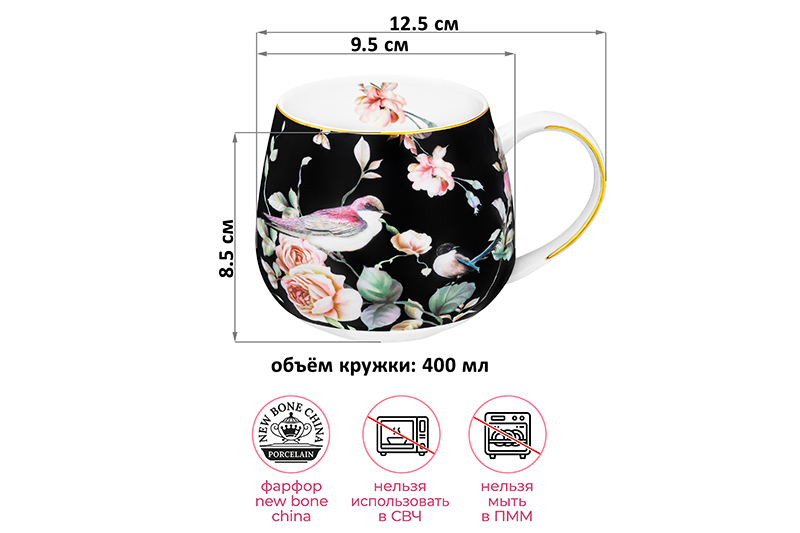 Кружка Elan Gallery "Певчие птички на чёрном" размером 12,5х9,5х8,5 см и объёмом 400 мл выполнена из фарфора нового поколения new bone china. Материал сочетает в себе изящность и высокую прочность. От других видов костяного фарфора отличается большей экологичностью в производстве. Кружечка с изображениями птичек и розовых цветов на чёрном фоне украшена золотистым кантом. Имеет оригинальную форму бочонка. Она поможет провести множество приятных завтраков с капучино или латте, а также уютных чайных вечеров. Кружка подходит ценителям чая и кофе, которые любят пить из красивой и необычной посуды. Это идеальный вариант для того, чтобы согреться горячим напитком зимой и освежиться прохладным лимонадом летом. Интересная кружка с удобной ручкой украсит ваш стол своим красивым дизайном как на праздник, так и в будни. Посуда из фарфора идеально впишется в любой интерьер вашей кухни. Фарфоровые чашки отличаются от керамических повышенной плотностью. Они не впитывают цвет кофе, чая, глинтвейна, других горячих напитков и не деформируются от влаги, чему может быть подвержена керамика. Не рекомендуется применять абразивные моющие средства. Из-за золотого канта не подходит для использования в микроволновой печи и посудомоечной машине. Бокал поставляется в стильной картонной упаковке. Фарфоровая посуда – отличный подарок на любой праздник. Благодаря красочной коробочке не понадобится дополнительная подарочная упаковка. Наслаждайтесь любимыми напитками из этой кружечки сами, либо сделайте оригинальный подарок своим близким! В коллекции бренда Элан Галерея представлено много стильных товаров для дома, в том числе всё для эстетичного чаепития. Выберите варианты на свой вкус!