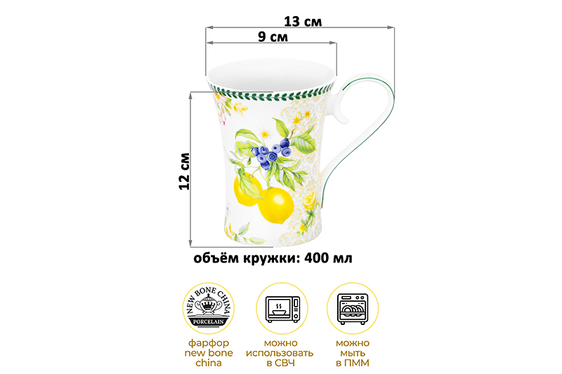 Кружка из серии «Лимоны» от Elan Gallery предназначена для эстетичной сервировки вашего стола. Размер ёмкости – 13х9х12 см, объём – 400 мл. Выполнена из фарфора нового поколения new bone china, сочетающего в себе изящность и высокую прочность. Такие изделия легко отмываются, поэтому сохраняют привлекательный вид и практичны в использовании. Плотная структура материала позволяет посуде дольше сохранять температуру блюд и напитков. От других видов костяного фарфора new bone china отличается большей экологичностью в производстве. Изделие с ярким рисунком в виде лимонов изящно дополнит интерьер любой кухни или столовой, привнеся нотки свежести и солнечного тепла. Кофейная кружка поможет вам провести множество приятных завтраков с капучино и латте, а также уютные чайные вечера с конфетами, вафлями, другими десертами и сладостями. Подойдёт ценителям чая и кофе, которые любят пить из красивой и необычной посуды. Согрейтесь зимой любимым горячим напитком: какао с маршмэллоу, ягодным чаем или горячим шоколадом. Летом освежитесь домашним лимонадом или морсом. Декоративное изделие позволит организовать запоминающееся чаепитие. Не рекомендуется применять абразивные моющие средства. Подходит для использования в посудомоечной машине и микроволновой печи. Поставляется в стильной картонной коробке – благодаря ей вам не потребуется дополнительная подарочная упаковка. Фарфоровая сервировочная посуда будет оригинальным подарком для хозяйки, ценящей не только практичность, но и привлекательность. Серия «Лимоны» от бренда Элан Галерея станет украшением любого кухонного инвентаря и позволит собрать сервиз в едином стиле!