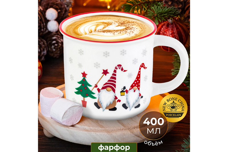 Кружка 400 мл 13*9,5*8,8 см "Гномики с елкой" с красной каймой NEW BONE CHINA