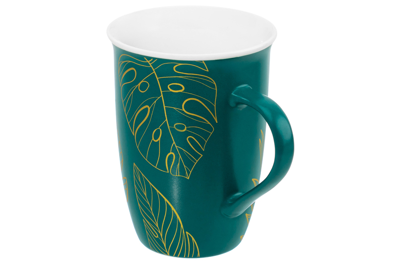 Кружка «Листья» предназначена для красивой сервировки стола. Размер ёмкости – 12,5х9х12,5 см, объём – 450 мл. Выполнена из фарфора нового поколения new bone china, сочетающего в себе изящность и высокую прочность. За счёт гладкости изделия легко отмываются, поэтому сохраняют привлекательный вид и практичны в использовании. Плотная структура материала позволяет посуде дольше сохранять температуру блюд и напитков. От других видов костяного фарфора new bone china отличается большей экологичностью в производстве. Элегантная тёмно-зелёная кружка с контурным рисунком золотых листьев дополнит любой интерьер и подарит хорошее настроение как взрослым, так и детям! Декоративная чашка поможет провести множество приятных завтраков с капучино и латте, а также уютные чайные вечера. Она подойдёт ценителям кофе и чая, которые любят пить из красивой и необычной посуды. Согрейтесь любимым горячим напитком зимой или освежитесь лимонадом летом. Кружечка дополнит ваш стол на любом чаепитии, а изысканный дизайн обязательно впишет её в интерьер вашей квартиры. Подойдёт как женщинам, так и мужчинам. Не рекомендуется применять абразивные моющие средства. Подойдёт для использования в микроволновой печи и посудомоечной машине. Поставляется в яркой картонной упаковке. Создайте уют у себя дома или сделайте приятный подарок родным, близким и коллегам!