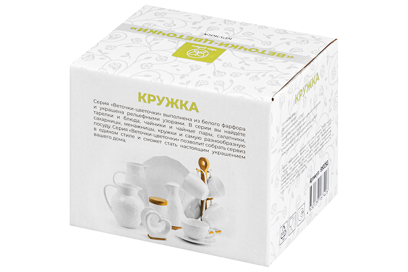 Кружка Elan Gallery "Веточки-цветочки" размером 13,5х10х9 см и объёмом 480 мл выполнена из белого фарфора с рельефным узором. Кружечка подходит ценителям чая и кофе, которые любят пить из красивой и необычной посуды. Это идеальный вариант для того, чтобы согреться горячим напитком зимой и освежиться прохладным лимонадом летом. Интересная кружечка с удобной ручкой украсит ваш стол своим стильным дизайном как на праздник, так и в будни. Кружка поможет провести множество приятных завтраков с капучино или латте, а также уютных чайных вечеров. Выполнена из высококачественного белого фарфора. Фарфоровые чашки отличаются от керамических повышенной плотностью. Они не впитывают цвет кофе, чая, глинтвейна, других горячих напитков и не деформируются от влаги, чему может быть подвержена керамика. Можно использовать в микроволновой печи и мыть в посудомоечной машине. Поставляется в стильной картонной упаковке. Белая фарфоровая кружка "Веточки-цветочки" порадует ваших близких на любой праздник или станет настоящим украшением вашей кухни!
