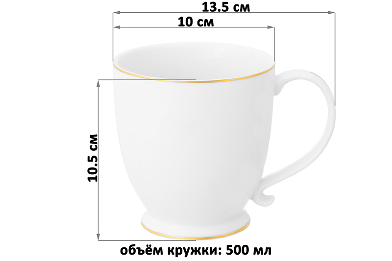 Кружка из серии «Белая с золотом» предназначена для красивой сервировки стола. Размер ёмкости – 13,5х10х10,5 см, объём – 500 мл. Выполнена из фарфора нового поколения new bone china, сочетающего в себе изящность и высокую прочность. За счёт гладкости изделия легко отмываются, поэтому сохраняют привлекательный вид и практичны в использовании. Плотная структура материала позволяет посуде дольше сохранять температуру блюд и напитков. От других видов костяного фарфора new bone china отличается большей экологичностью в производстве. Белая фарфоровая посуда с элегантным золотистым кантом станет изящным дополнением интерьера любой кухни, столовой и гостиной. Кофейная кружка поможет провести множество приятных завтраков с капучино или латте, а также уютные чайные вечера с конфетами, вафлями, другими десертами и сладостями. Подойдёт ценителям чая и кофе, которые любят пить из красивой и необычной посуды. Согрейтесь зимой любимым горячим напитком: какао с маршмэллоу, ягодным чаем, горячим шоколадом. Летом освежитесь домашним лимонадом или морсом. Декоративная кружечка добавит эстетики любому чаепитию. Не рекомендуется применять абразивные моющие средства. Не подходит для использования в микроволновой печи и посудомоечной машине. Поставляется в картонной коробке. Фарфоровая сервировочная посуда послужит оригинальным подарком для хозяйки, ценящей не только практичность, но и привлекательность. Серия «Белая с золотом» станет украшением любого кухонного инвентаря и позволит собрать сервиз в едином стиле!
