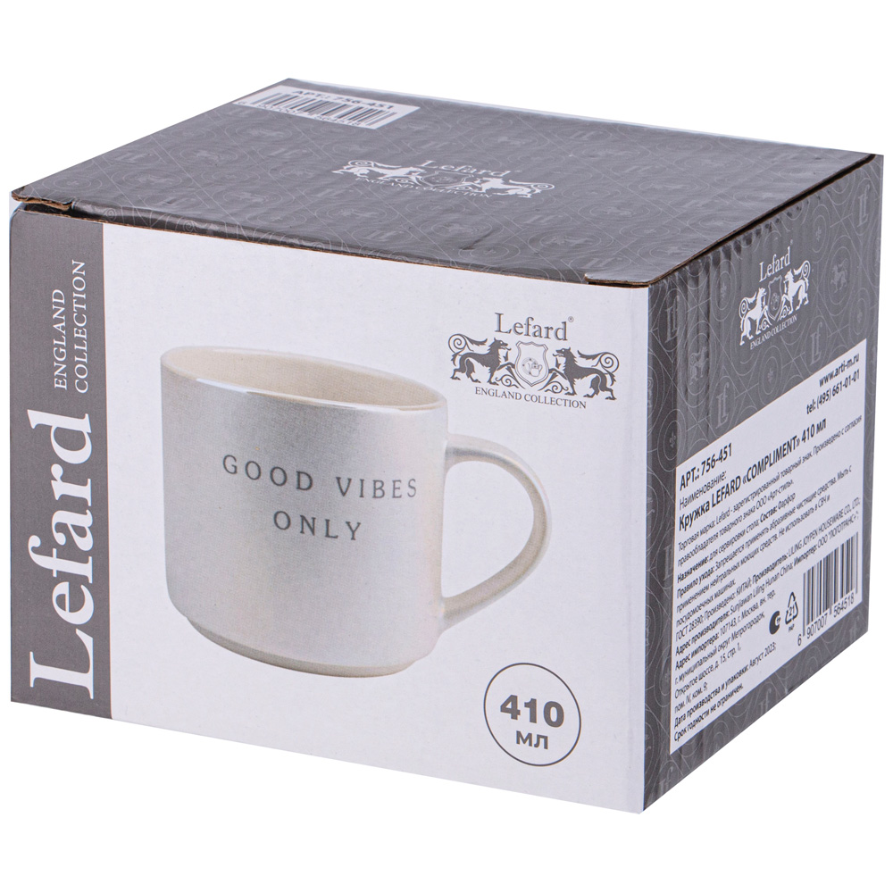 КРУЖКА LEFARD "COMPLIMENT" объемом 410МЛ выполнена в стиле минимализм. Приглушенные оттенки и лаконичный силуэт - как символ спокойного дня.Кружки LEFARD - это интересные дизайнерские решения, функциональные и стильные вещи для жизни. Вы можете использовать кружки как чашки для чая, кофейные чашки, так и подавать в них холодные напитки. Кружка идеальна в подарок любимым, друзьям, родным, коллегам, любимой бабушке, жене, лучшей подруге на день рождения, новый год, новоселье, юбилей, просто так без повода.