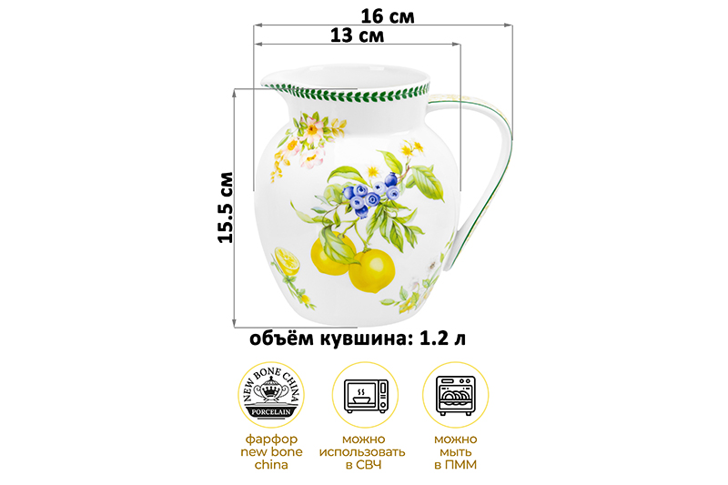 Кувшин 1,2 л 16*13*15,5 см "Лимоны" NEW BONE CHINA