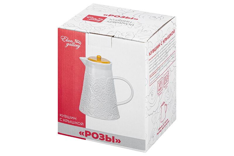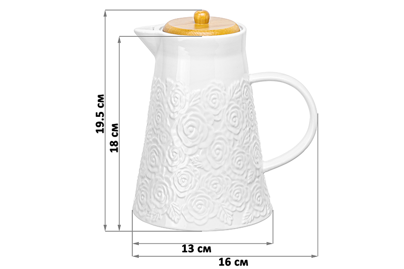 Кувшин серии "Розы" объемом 1,2 литра с крышкой подойдет для хранения и подачи соков, компотов, чая, лимонадов и самых разных горячих или холодных напитков. Кувшин выполнен из высококачественного фарфора, украшен рельефными узорами и подходит для составления декоративных композиций. Крышка кувшина выполнена из натурального бамбука. Благодаря силиконовому уплотнителю крышка прочно сидит и не спадает при наклоне. Ручкой кувшина удобно пользоваться, а носик не проливает мимо. Кувшин без крышки можно использовать в микроволновой печи и посудомоечной машине. Поставляется в яркой картонной упаковке. Кувшин из серии посуды "Розы" сможет стать настоящим украшением кухни или приятным подарком для ваших родных и близких!