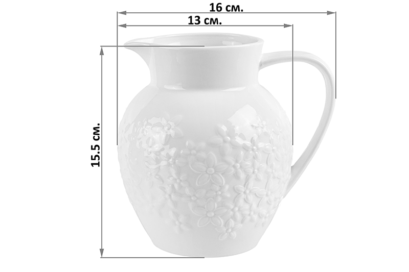 Кувшин серии «Цветочки» объемом 1,3 литра подойдет для красивой подачи холодных или горячих напитков: воды, молока, лимонадов, сока, чая и многих других. Кувшин выполнен из высококачественного фарфора и украшен рельефными узорами. Подходит для использования в микроволновой печи и посудомоечной машине. Поставляется в яркой картонной упаковке. Кувшин из серии посуды «Цветочки» сможет стать настоящим украшением кухни или приятным подарком для ваших родных и близких!