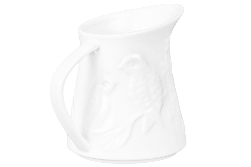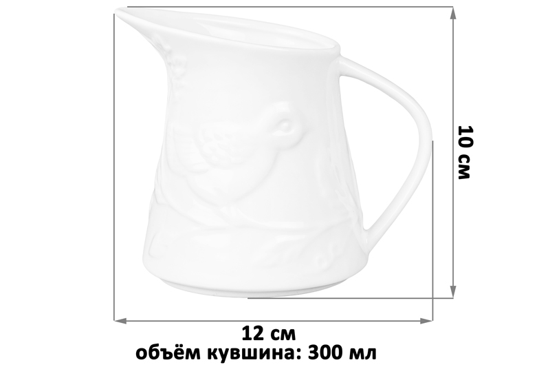 Кувшин для молока «Птички на ветке» объемом 300 мл выполнен из высококачественного фарфора. Кувшинчик вместительный с интересным рельефом станет прекрасной альтернативой скучным пакетам и бутылкам молока. С таким кувшинчиком можно красиво сервировать чаепитие или утренний кофе. В серии посуды из белого фарфора представлен широкий ассортимент товаров для сервировки стола, которые, несомненно, впишутся в любой интерьер благодаря лаконичному дизайну, натуральным материалам и высокой функциональности. Такому подарку будет рада любая хозяйка!