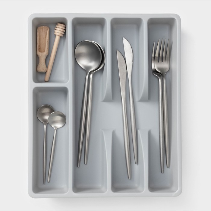 Организуйте порядок на кухне с умом! Лоток для столовых приборов на пять отделений — это практичное решение для хранения ложек, вилок и ножей. Размеры 25.5×30.7 см оптимальны для размещения на столешнице или в ящике, а нейтральный серый цвет сочетается с любой кухонной палитрой.