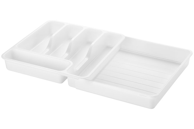 Раздвижной лоток для столовых приборов и кухонной утвари от ELCASA белого цвета поможет в организации компактного хранения и поддержании порядка. Размер контейнера в сложенном виде – 33х29,5х5,3 см, в разложенном виде – 55х33х5х5,3 см. Органайзер в сложенном виде имеет 5 отделений разного размера: 3 отделения по 23,5х6х5 см, 1 отделение 31х6х5 см и 1 отделение 20х6х5 см. Раздвинув лоток в ширину, вы получаете ещё 1 дополнительное отделение, размер которого можете регулировать на свое усмотрение. Оно представляет собой выдвижной поддон, его ширина регулируется. При выборе органайзера для своего выдвижного ящика на кухне ориентируйтесь на указанные параметры. Ёмкость с секциями выполнена из пищевого пластика – полипропилена. Он не выделяет вредных веществ, что является находкой для ценителей экологичных материалов. Горизонтальная подставка подойдёт для хранения ложек, вилок, ножей и прочего кухонного инвентаря. Можно использовать в офисе или дома как систему хранения канцелярии в ящичке рабочего стола. Органайзер с разделителями подойдёт для хранения письменных приспособлений, канцелярских принадлежностей и различных аксессуаров и мелочей. Пластиковый лоток поможет эффективно использовать пространство и уместить большое количество вещей. Не рекомендуется применять абразивные моющие средства. Регулируемый ящик с секциями позволит поддерживать порядок на вашей кухне и держать кухонные приборы и хозяйственные инструменты под рукой. В коллекции бренда ELCASA представлено много функциональных товаров для дома, которые привнесут комфорт и уют в домашний интерьер.