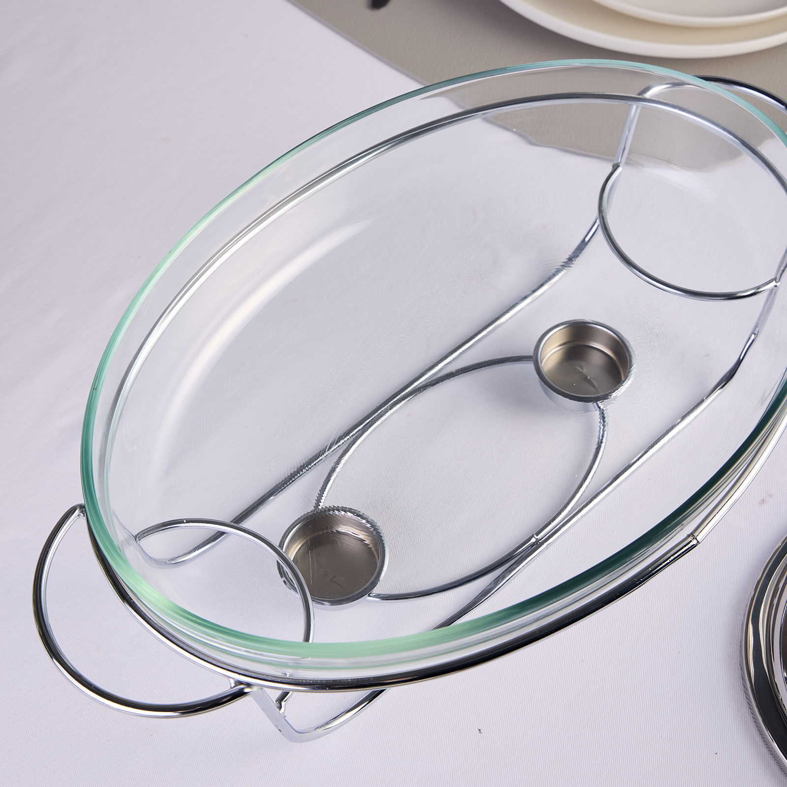 Стеклянную жаропрочную емкость можно использовать для запекания в духовом шкафу (максимальная температура нагрева до 400 С). Стеклянную емкость и крышку можно мыть в посудомоечнйо машине, хромированная подставка не подходит для мытья в посудомоечной машине.