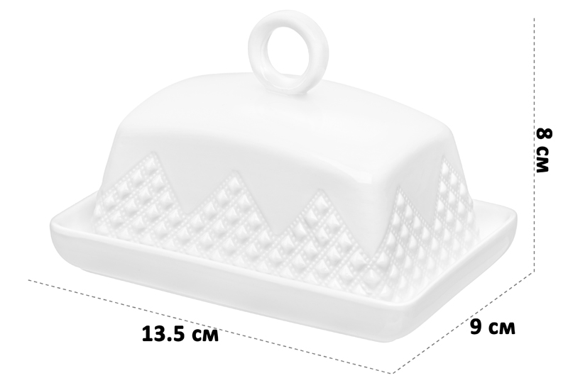 Масленка с крышкой серии "Ромбики" 13,5х9х8 см выполнена из белого фарфора и украшена рельефными узорами. Фарфоровое изделие создано для эстетичной подачи масла на стол во время завтрака или чаепития. При хранении в холодильнике сливочное масло не будет впитывать запахи других продуктов благодаря крышке. В фарфоровую ёмкость помещается кусок масла 9,5х5х4 см. Масленка сохранит его натуральный запах и насыщенный вкус. Можно использовать в роли контейнера для кусочков сыра. В серии "Ромбики" также представлены другие товары для сервировки стола и красивый кухонный инвентарь, что позволяет собрать сервиз на свой вкус. Не рекомендуется применять абразивные моющие средства. Можно мыть в посудомоечной машине. Поставляется в стильной коробке. Станет чудесным подарком на любой праздник. Серия посуды "Ромбики" создаст в вашем доме уютную атмосферу и станет украшением любой кухни! В ассортименте бренда Elan Gallery вы найдёте много красивых товаров для создания комфорта и уюта в доме и кухонных принадлежностей.