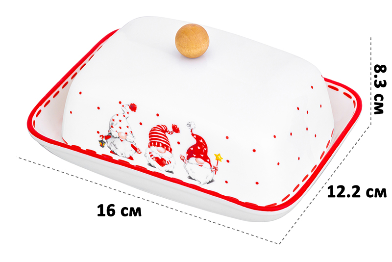 Масленка серии "Веселые гномики" 16х12,2х8,3 см позволит вам эстетично подавать масло на стол - идеально для завтраков и чаепитий! Масленка выполнена из высококачественного фарфора и украшена яркими изображениями гномиков. Гномы, маленькие новогодние помощники, принесут праздничную атмосферу и подарят каждому хорошее настроение. При хранении в холодильнике масло не будет впитывать запахи других продуктов благодаря крышке. Масленка сохранит его натуральный запах и насыщенный вкус. В масленку помещается кусок масла 13х8,5х5 см. Использовать в микроволновой печи и посудомоечной машине можно только фарфоровую тарелочку. Крышку с бамбуковой ручкой нельзя замачивать. Набор поставляется в стильной картонной упаковке. Масленка из серии посуды "Веселые гномики" сможет стать настоящим украшением кухни или приятным подарком для ваших родных и близких!