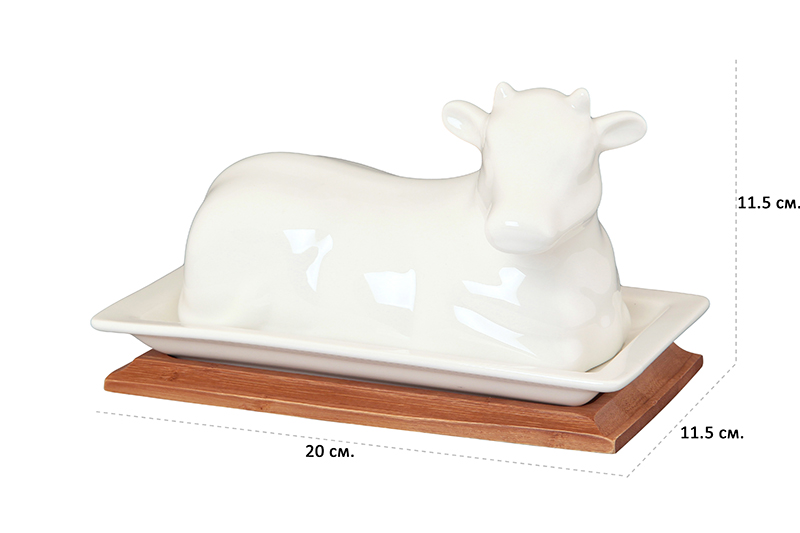 Масленка «Коровка» с крышкой в форме коровы выполнена из высококачественного фарфора, а подставка — из натурального бамбука. Позволит вам эстетично подавать масло на стол — идеально для завтраков и чаепитий! При хранении в холодильнике масло не будет впитывать запахи других продуктов благодаря крышке. В масленку помещается кусок масла 14х6х5,5 см. Масленка сохранит его натуральный запах и насыщенный вкус. В серии фарфоровой посуды с использованием бамбука представлен широкий ассортимент товаров для сервировки стола, которые впишутся в любой интерьер благодаря лаконичному дизайну, натуральным материалам и высокой функциональности. Такому подарку будет рада любая хозяйка!