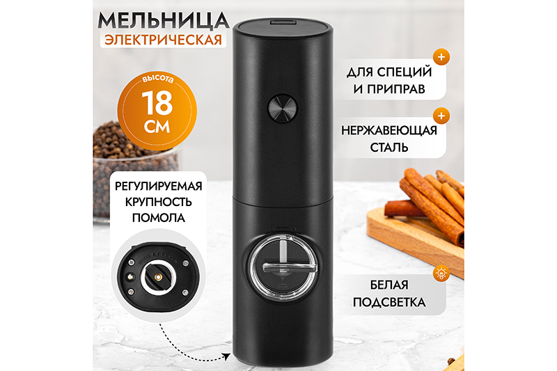 Электрическая мельница от бренда Elan Gallery станет практичным аксессуаром для вашего кухонного инвентаря. Выполнена из ABS-пластика. Он устойчив к воздействую влаги и перепадам температуры, благодаря чему электромельница долго прослужит вам, не теряя своей функциональности и эстетичности. Керамические жернова гарантируют деликатный и точный помол, подчёркивая вкус натуральных продуктов. Они не ржавеют, не впитывают запахи и не перегреваются при длительной работе. Изделие работает на 4 батарейках формата ААА (в комплект не входят!). Отделение для батареек располагается в верхней части прибора. Кнопка на корпусе отвечает за включение и выключение. Продукты за измельчения засыпаются в ёмкость через отверстие, прикрытое пластиковой крышкой. Она имеет два положения: открытое и закрытое. Для определения выбранного положения на контейнере имеются значки замков, а на крышке – указатель. В нижней части приспособления располагается ручка для регулирования степени помола: от крупного (coarse) до мелкого (fine). Рядом имеется лампочка белой светодиодной подсветки. Изделие поможет вам приправить любимые блюда солью, перцем, корицей, чесноком, луком и более экзотическими специями. В комплект входит подробная печатная инструкция. Поставляется в дизайнерской картонной коробке – благодаря ей вам не потребуется дополнительная подарочная упаковка. Электромельница от бренда Элан Галерея будет незаменимой принадлежностью и функциональным дополнением вашей бытовой утвари. Она сделает вкус готовых блюд насыщеннее и пикантнее, добавив особого удовольствия процессу готовки!