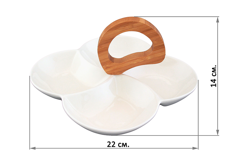 Менажница «Айсберг» выполнена из высококачественного фарфора с 4-мя секциями и деревянной ручкой. Объем каждой секции 125 мл, а ручка сконструирована для удобной переноски. Менажница прекрасно подходит для сервировки орешков, закусок, оливок, сладостей и благодаря необычному дизайну украсит любой стол. В серии фарфоровой посуды с использованием бамбука представлен широкий ассортимент товаров для сервировки стола, которые, несомненно, впишутся в любой интерьер благодаря лаконичному дизайну, натуральным материалам и высокой функциональности. Такому подарку будет рада любая хозяйка!