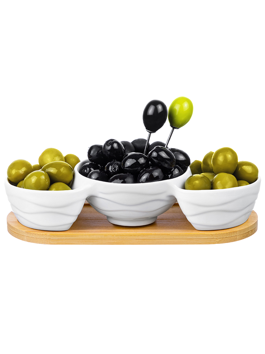Менажница из серии «Айсберг волны» от Elan Gallery предназначена для эстетичной сервировки вашего стола. Размер изделия – 22х9,5х5,8 см. Объём маленьких секций – 70 мл каждая, объём большой секции – 150 мл. Выполнена из высококачественного белого фарфора. Он не впитывает цвет продуктов и легко отмывается, благодаря чему надолго сохраняет свою белизну. Поверхность изделия украшают рельефные узоры в виде поперечных волн. Подставка выполнена из бамбука, шпажки выполнены из металла. Менажница поможет красиво подавать маслины, орехи или сыры. Она станет незаменимым элементом праздничных обедов или неторопливых завтраков. Послужит в качестве конфетницы, позволив угостить себя и гостей любимыми сладостями: конфетами, мармеладом, леденцами или безе. Металлические шпажки помогут вам взять угощение. Без бамбуковой подставки и шпажек подходит для использования в посудомоечной машине и микроволновой печи. Бамбук нельзя замачивать! Поставляются в дизайнерской картонной коробке – благодаря ей вам не потребуется дополнительная подарочная упаковка. Фарфоровая сервировочная посуда будет оригинальным подарком для хозяйки, ценящей не только практичность, но и привлекательность. Серия «Айсберг волны» от бренда Элан Галерея станет украшением любого кухонного инвентаря и позволит собрать красивый сервиз в едином стиле!