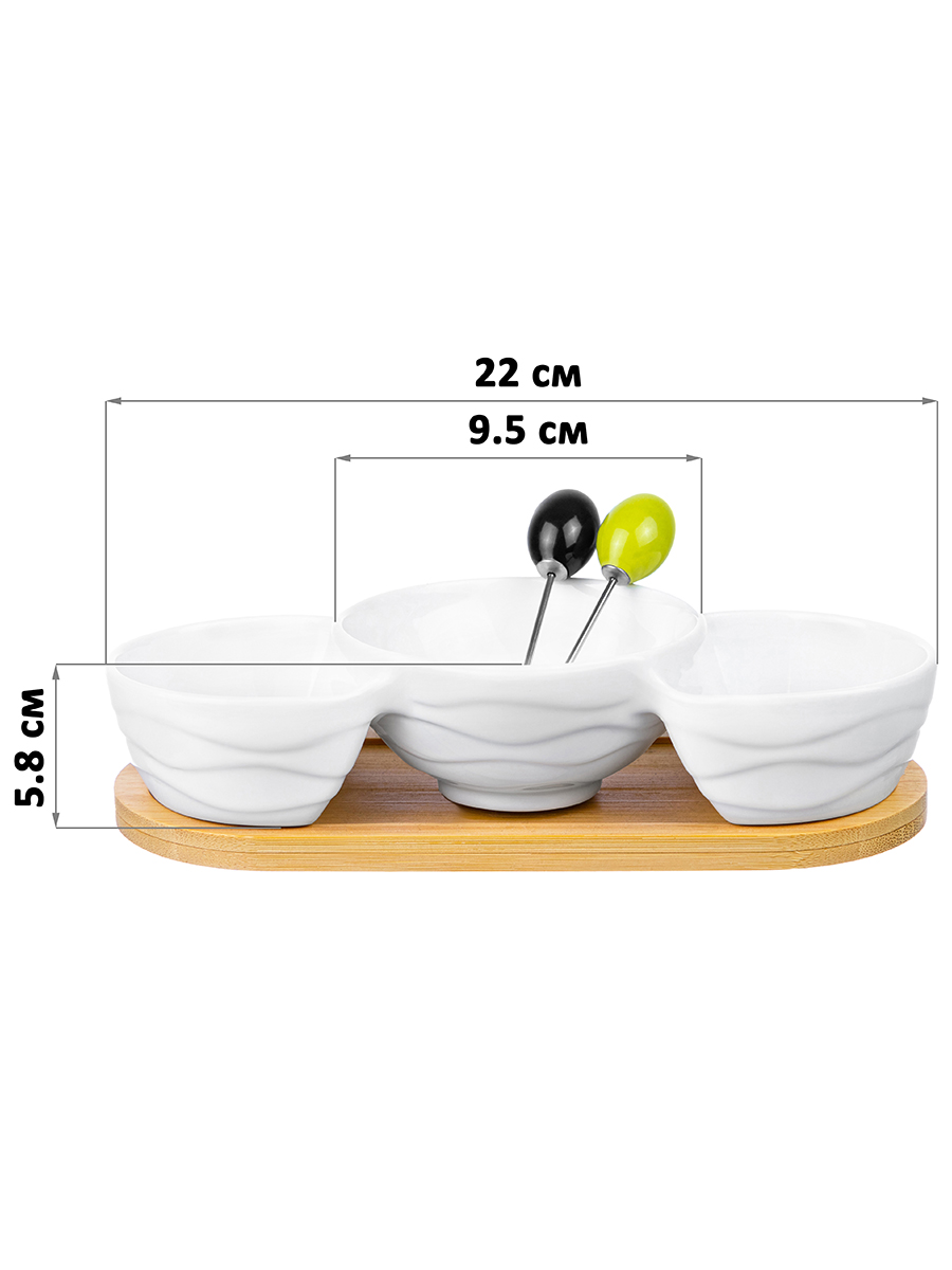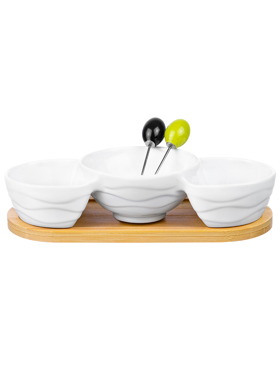 Менажница 22*9,5*5,8 см "Айсберг волны" цельная глубокая 3 секции + 2 шпажки + дерев. подставка