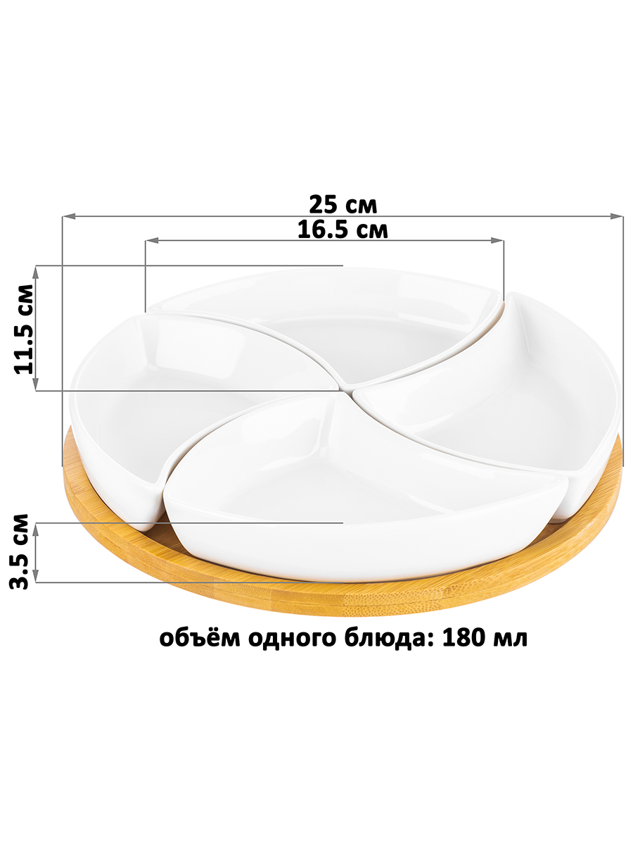 Менажница Elan Gallery "Айсберг" размером 25х25х5 см имеет четыре отделения по 180 мл и крутящуюся подставку. Секции можно вынимать и использовать по отдельности. Размер каждого отделения 16,5х11,5х3,5 см. Вращающаяся менажница подойдет для сервировки и подачи различных закусок: сырной и мясной нарезки, канапе, роллов. Сервировочное блюдо пригодится, чтобы создать идеальную атмосферу для приема гостей или романтического ужина дома. Благодаря отдельным секциям вы можете использовать одну и ту же тарелочку для солений, оливок, сыра и колбасы. Такой подход к сервировке позволит сэкономить место на вашем столе. Возьмите менажницу на пикник, её эргономичная форма позволит разместить все необходимые закуски и сладости. Ёмкости выполнены из высококачественного белого фарфора. Подставка изготовлена из натурального бамбука. Фарфоровая посуда отличается от керамической повышенной плотностью. Фарфор не впитывает цвет продуктов и не деформируется от влаги, чему может быть подвержена керамика. Ёмкости без бамбуковой подставки можно использовать в микроволновой печи и посудомоечной машине. Подставку из бамбука нельзя замачивать. Набор поставляется в стильной картонной упаковке. Посуда из белого фарфора с бамбуковыми деталями подойдёт к любому интерьеру кухни и станет отличным подарком для любой хозяйки. Крутящееся сервировочное блюдо из серии посуды "Айсберг" сможет стать настоящим украшением стола и элементом декора вашей кухни!