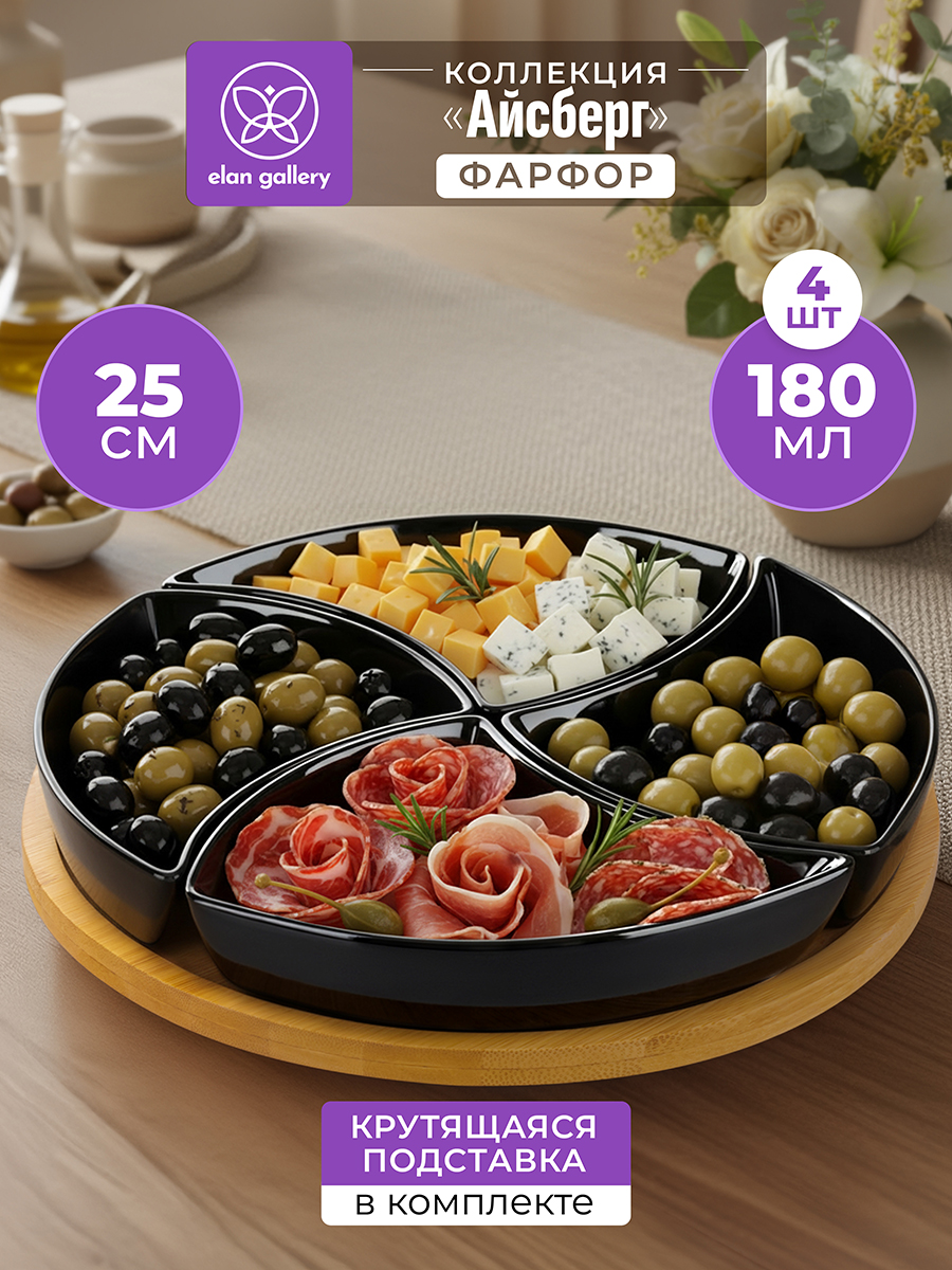 Менажница от бренда Elan Gallery "Айсберг" подойдёт для красивой подачи закусок, сыра к вину и различных сладостей к чаю. Выполнена из фарфора, имеет в комплекте крутящуюся бамбуковую подставку. Представляет собой 4 фигурные формы, которые снимаются с подставки и могут быть использованы по отдельности. Общий размер комплекта – 25х25х5 см. Объём каждой ёмкости – 180 мл, размер каждой ёмкости – 16,5х11,5х3,5 см. Заполните секционную тарелочку разными угощениями: орехами и оливками, сухофруктами, ягодами или конфетами. Благодаря вращающейся подставке можно легко взять закуску из нужного отделения. Каждая секция станет сервировочной тарелкой для варенья, мёда или соуса. Подойдёт для подачи небольших кусочков фруктов и овощей. В некоторые отсеки можно положить сырные ломтики, мясную нарезку и орешки, а другие использовать как соусники к этим угощениям. Такая сервировка украсит праздничный стол и сэкономит место на нём. Не рекомендуется применять абразивные моющие средства. Без бамбуковых элементов фарфоровые ёмкости можно использовать в посудомоечной машине и микроволновой печи. Бамбук нельзя замачивать. Блюдо на подставке поставляется в красивой картонной коробке. Посуда станет прекрасным подарком на любой праздник и стильным дополнением вашего кухонного инвентаря. Благодаря стильной коробочке не понадобится подарочная упаковка, если вы решите преподнести сюрприз. В коллекции бренда Элан Галерея представлено много стильных товаров для дома, выберите варианты на свой вкус!