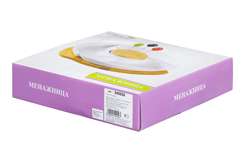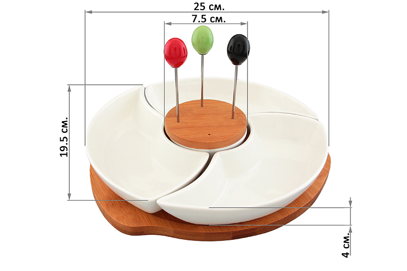 Менажница 25*25*6 см "Айсберг" крутящ. 3 секции + 3 шпажки на дерев. подст. + секц. д/хр. шпажек