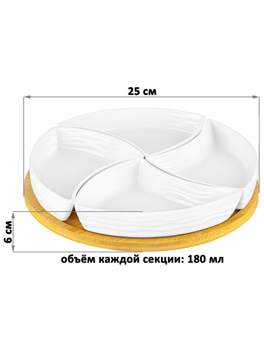 Менажница 25*25*6 см "Айсберг волны" крутящ. 4 секции на дерев. подставке