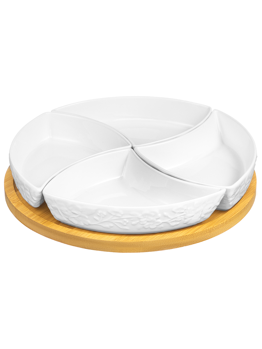 Менажница Elan Gallery "Цветущая сакура" размером 25х25х6 см имеет четыре отделения по 180 мл и крутящуюся подставку. Секции можно вынимать и использовать по отдельности, размер каждой – 17х12х3,5 см. Вращающаяся менажница подойдет для сервировки и подачи различных закусок: сырной и мясной нарезки, канапе, роллов. Сервировочное блюдо пригодится, чтобы создать идеальную атмосферу для приема гостей или романтического ужина дома. Благодаря отдельным секциям вы можете использовать одну и ту же тарелочку для солений, оливок, сыра и колбасы. Такой подход к сервировке позволит сэкономить место на вашем столе. Возьмите менажницу на пикник, её эргономичная форма позволит разместить все необходимые закуски и сладости. Формы выполнены из белого фарфора с декоративными рельефными узорами в виде цветов. Подставка изготовлена из натурального бамбука. Фарфоровая посуда отличается от керамической повышенной плотностью. Фарфор не впитывает цвет продуктов и не деформируется от влаги, чему может быть подвержена керамика. Не рекомендуется применять абразивные моющие средства. Без бамбуковой подставки ёмкости можно использовать в микроволновой печи и посудомоечной машине. Подставку из бамбука нельзя замачивать. Набор поставляется в стильной картонной упаковке. Посуда из белого фарфора с бамбуковыми деталями подойдёт к любому интерьеру кухни и станет отличным подарком для любой хозяйки. Крутящееся сервировочное блюдо из серии посуды "Цветущая сакура" станет украшением стола и элементом декора вашей кухни!