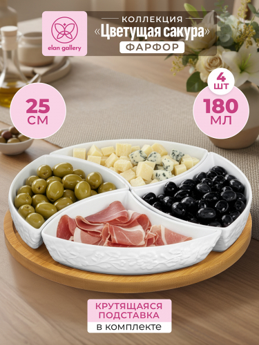 Менажница Elan Gallery "Цветущая сакура" размером 25х25х6 см имеет четыре отделения по 180 мл и крутящуюся подставку. Секции можно вынимать и использовать по отдельности, размер каждой – 17х12х3,5 см. Вращающаяся менажница подойдет для сервировки и подачи различных закусок: сырной и мясной нарезки, канапе, роллов. Сервировочное блюдо пригодится, чтобы создать идеальную атмосферу для приема гостей или романтического ужина дома. Благодаря отдельным секциям вы можете использовать одну и ту же тарелочку для солений, оливок, сыра и колбасы. Такой подход к сервировке позволит сэкономить место на вашем столе. Возьмите менажницу на пикник, её эргономичная форма позволит разместить все необходимые закуски и сладости. Формы выполнены из белого фарфора с декоративными рельефными узорами в виде цветов. Подставка изготовлена из натурального бамбука. Фарфоровая посуда отличается от керамической повышенной плотностью. Фарфор не впитывает цвет продуктов и не деформируется от влаги, чему может быть подвержена керамика. Не рекомендуется применять абразивные моющие средства. Без бамбуковой подставки ёмкости можно использовать в микроволновой печи и посудомоечной машине. Подставку из бамбука нельзя замачивать. Набор поставляется в стильной картонной упаковке. Посуда из белого фарфора с бамбуковыми деталями подойдёт к любому интерьеру кухни и станет отличным подарком для любой хозяйки. Крутящееся сервировочное блюдо из серии посуды "Цветущая сакура" станет украшением стола и элементом декора вашей кухни!