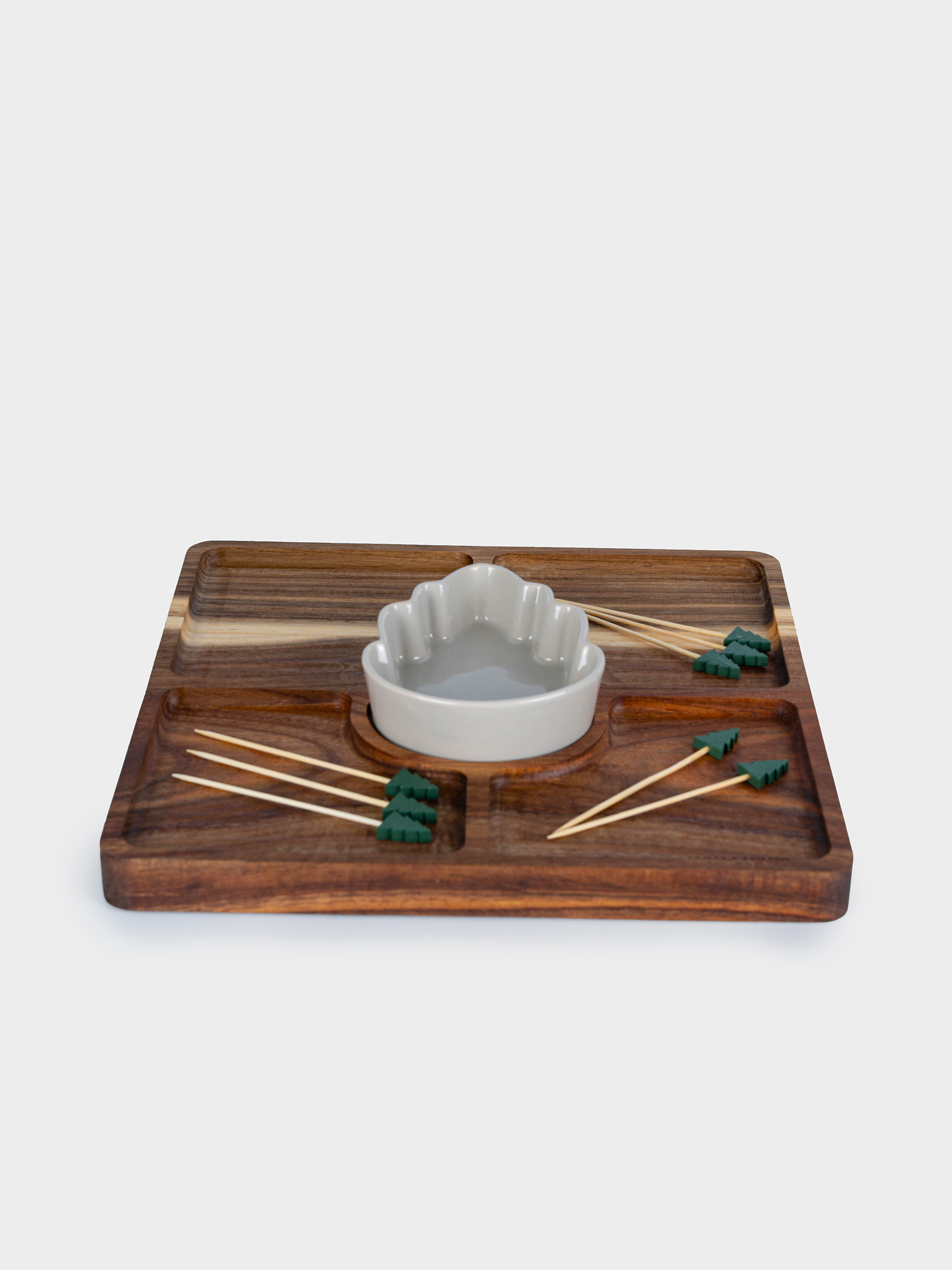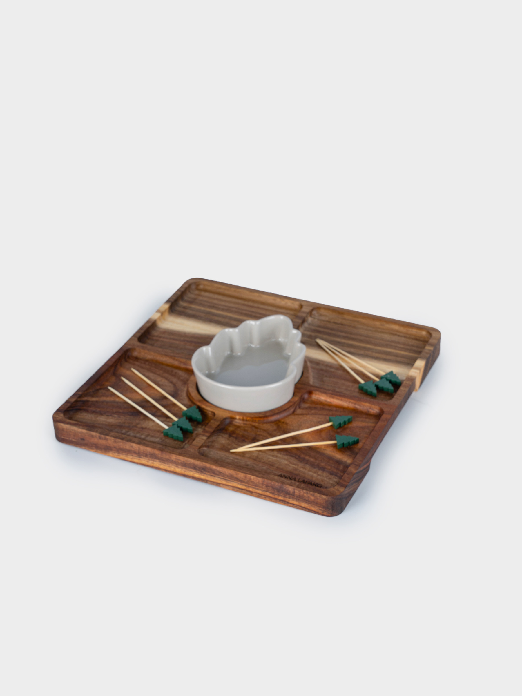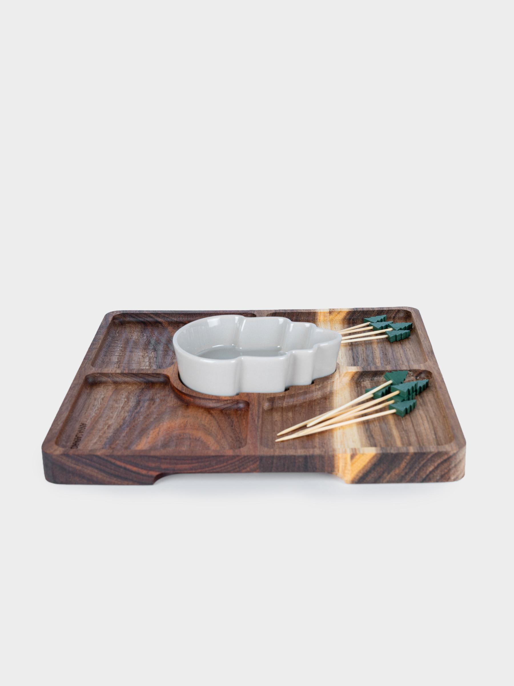 Менажница, 4 отделения, с пиалой, со шпажками для канапе. Комплектация и размеры: менажница - 25х25х2 см, 1 шт, пиала - 11,5 см, 1 шт,  шпажка - 10 шт, 8 см. Материал: дерево акации, керамика. Используется для сервировки стола и подачи закусок. Рекомендации по уходу: мыть вручную с применением мягких моющих средств. Не использовать для ухода абразивные чистящие средства и жесткие губки. Нельзя мыть в посудомоечной машине.