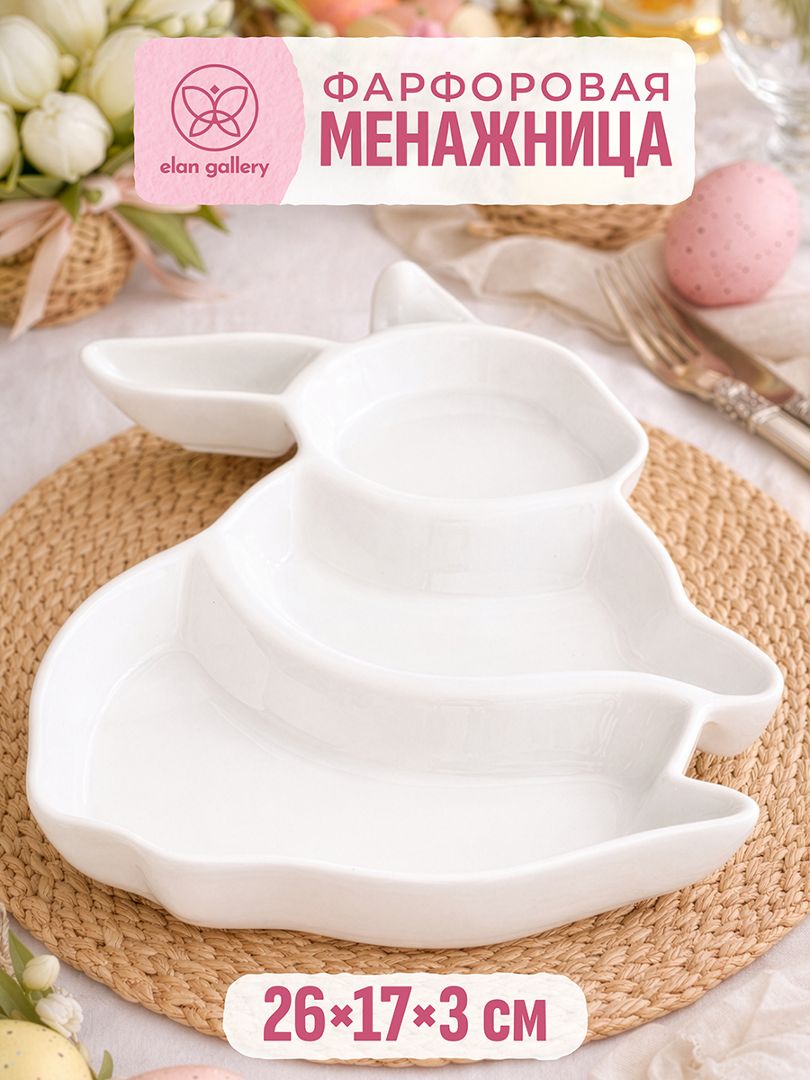 Менажница Elan Gallery "Заяц" размером 26х17х3 см имеет 5 секций (3 большие, 2 маленькие) и выполнена из фарфора. Фигурная сервировочная тарелка в виде зайчика с пятью отсеками станет незаменимой посудой для сервировки блюд на завтрак или ужин. Используйте её как обеденную или десертную. Сервировочное блюдо подойдёт для подачи к столу закусок: сыра, суши или роллов. Можно использовать как детскую для любых блюд, а также овощей и фруктов. Сделайте обычный ужин на кухне занимательной игрой! Тарелочку с разделителями можно использовать для детей, разложив соус, основное блюдо и гарнир в разные секции. Менажница подойдёт для ценителей правильного питания: секции позволят контролировать количество каждого продукта. Фарфоровые блюда отличаются от керамических повышенной плотностью. Фарфор не впитывает цвет и не деформируется от влаги, чему может быть подвержена керамика. Порционную тарелку можно использовать в микроволновой печи и посудомоечной машине. Поставляется в стильной картонной упаковке. Милая секционная тарелочка станет отличным подарком на любой праздник. Кухонный инвентарь забавной формы станет незаменимым помощником при сервировке стола и поднимет настроение взрослым и детям. В коллекции бренда Elan Gallery вы найдёте множество как ярких, так и нежных декоративных украшений – каждый обязательно подберёт сувенир на свой вкус. Они станут чудесным подарком для родных, близких и коллег. Наполните пространство вокруг себя уютом и эстетикой!