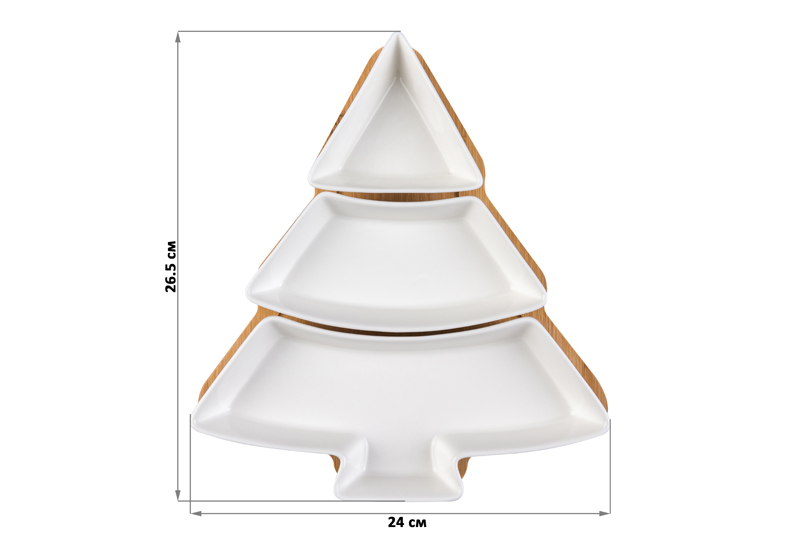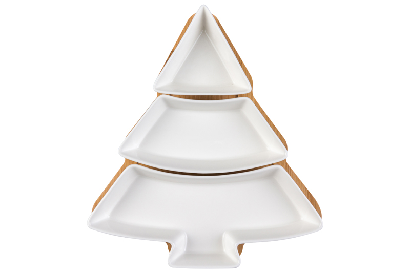 Блюдо для сервировки серии «Елочка» выполнено из высококачественного белого фарфора в форме елки. Три секции для разных угощений на деревянной подставке из натурального бамбука. Блюдо отлично впишется в праздничную сервировку стола и подходит для подачи закусок, нарезки, фруктов и любой другой еды. Сервировочное блюдо, упакованное в подарочную упаковку, станет изящным подарком любой хозяйке и будет радовать родных и близких не один год.