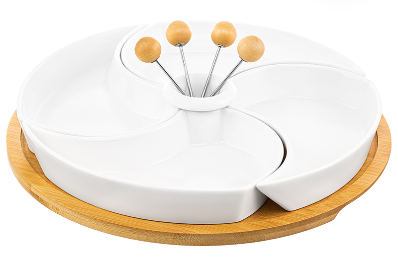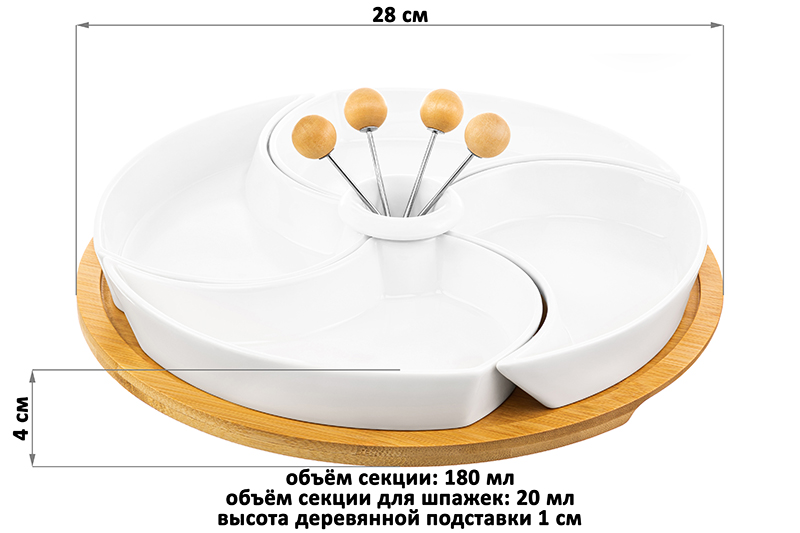 Менажница 28*25*4 см "Айсберг" 4 секции + 4 шпажки на дер. подст. + секц. д/хр. шпажек