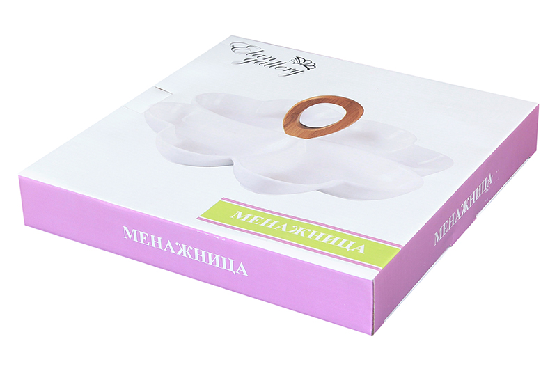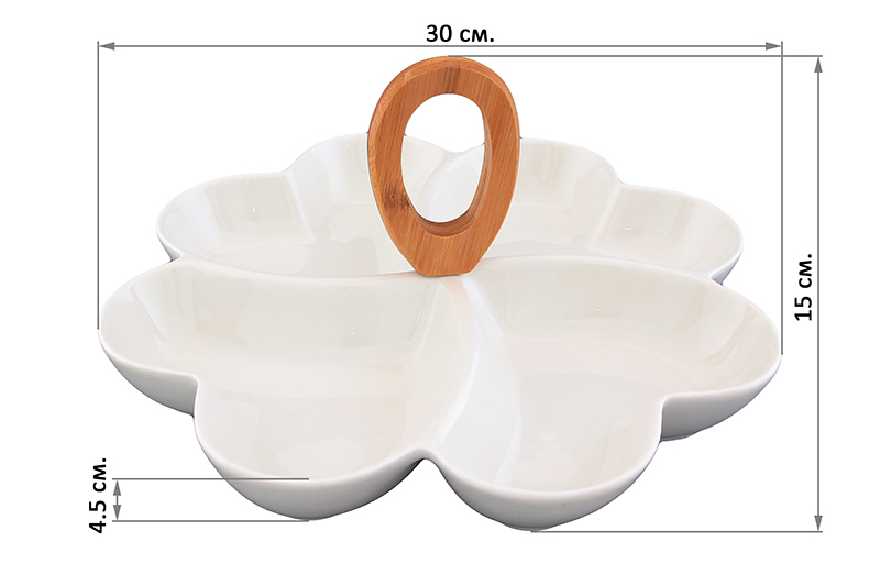 Менажница «Сердца» выполнена из высококачественного фарфора в форме сердец с 4-мя секциями и деревянной ручкой. Менажница прекрасно подходит для сервировки орешков, закусок, оливок, сладостей и благодаря необычному дизайну украсит любой стол. В серии фарфоровой посуды с использованием бамбука представлен широкий ассортимент товаров для сервировки стола, которые, несомненно, впишутся в любой интерьер благодаря лаконичному дизайну, натуральным материалам и высокой функциональности. Такому подарку будет рада любая хозяйка!