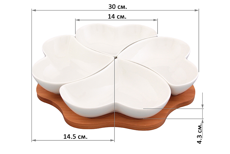 Менажница «Сердце» состоит из 4-х секции в форме сердец и деревянной подставки. Секции выполнены из высококачественного фарфора, а подставка из натурального бамбука. Секции легко снимаются, а вместе составляют изящный цветок. Менажница идеально подходит для сервировки закусок, орешков, оливок, сладостей и любых других продуктов. Также секции можно использовать по отдельности в качестве соусников или салатников. В серии фарфоровой посуды с использованием бамбука представлен широкий ассортимент товаров для сервировки стола, которые, несомненно, впишутся в любой интерьер благодаря лаконичному дизайну, натуральным материалам и высокой функциональности. Такому подарку будет рада любая хозяйка!