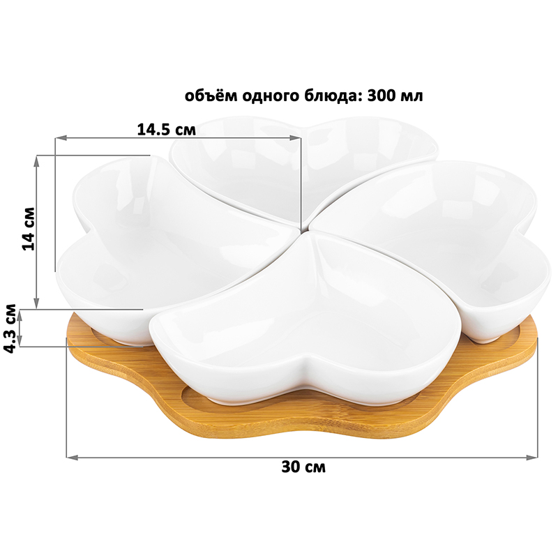 Менажница «Сердце» состоит из 4-х секции в форме сердец и деревянной подставки. Секции выполнены из высококачественного фарфора, а подставка из натурального бамбука. Секции легко снимаются, а вместе составляют изящный цветок. Менажница идеально подходит для сервировки закусок, орешков, оливок, сладостей и любых других продуктов. Также секции можно использовать по отдельности в качестве соусников или салатников. В серии фарфоровой посуды с использованием бамбука представлен широкий ассортимент товаров для сервировки стола, которые, несомненно, впишутся в любой интерьер благодаря лаконичному дизайну, натуральным материалам и высокой функциональности. Такому подарку будет рада любая хозяйка!