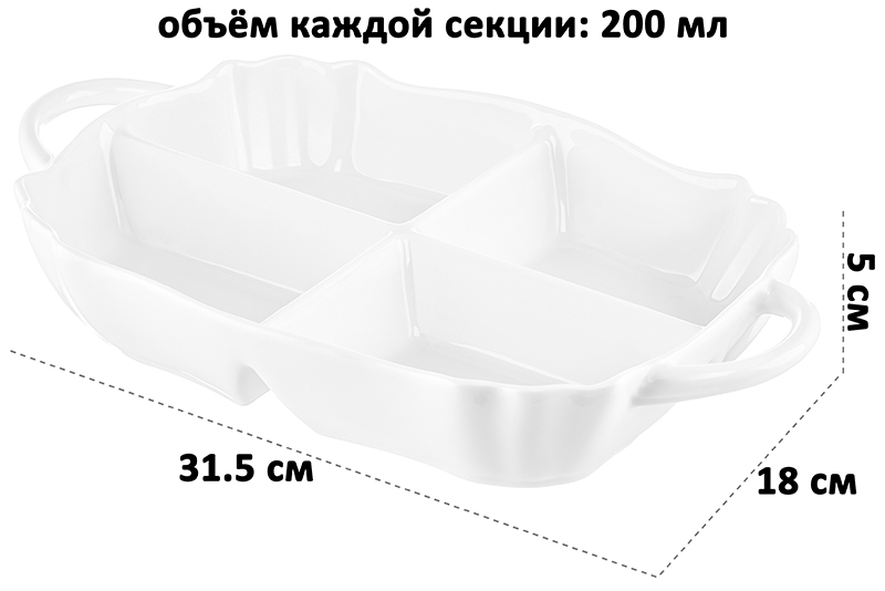 Глубокая менажница с ручками от бренда Elan Gallery "Айсберг" размером 31,5х18х5 см имеет 4 секции и выполнена из белого фарфора. Можно использовать в роли конфетницы для подачи разных конфет, мармелада и печенья. Представляет собой цельное блюдо с 4 глубокими отсеками объёмом по 200 мл каждый. Тарелка с разделителями создана для оригинальной сервировки и подачи различных закусок: сырной и мясной нарезки, оливок и маслин. Сервировочное блюдо пригодится, чтобы создать идеальную атмосферу для приема гостей или романтического ужина дома. Благодаря отдельным секциям вы можете использовать одну и ту же порционную тарелочку для солений, сыра и колбасы. Такой подход к сервировке позволит сэкономить место на вашем столе. Положите орехи, ягоды и кусочки овощей и фруктов в одно и то же блюдо, разложив их по отделениям. Возьмите на пикник, эргономичная форма позволит разместить все необходимые закуски и сладости. Форму можно использовать в роли салатника для маленьких порций салата. Избегать резких перепадов температур и беречь от механических повреждений. Не рекомендуется применять абразивные моющие средства. Можно использовать в микроволновой печи и мыть в посудомоечной машине. Посуда поставляется в красочной картонной упаковке. Эта менажница станет полезным подарком для хозяйки, которая ценит функциональные товары для дома и стильную сервировку. Серия "Айсберг" позволит собрать сервиз в едином стиле и станет украшением вашего дома.