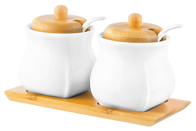 Набор «Тюльпан» состоит из 2-х банок объемом по 225 мл с деревянными крышками и фарфоровыми ложками на деревянной подставке. Набор подойдет для красивой подачи и хранения сахара, меда, варенья, специй, чая многих других продуктов. Банки и ложки выполнены из высококачественного фарфора, а подставка и крышки баночек — из натурального бамбука. Набор имеет изящную форму и хорошо впишется в интерьер. Размер набора 18х8,8х10 см. Банки без крышек можно использовать в микроволновой печи. Подставку и крышки нельзя мыть в посудомоечной машине. Набор поставляется в яркой картонной упаковке. Набор банок «Тюльпан» сможет стать настоящим украшением кухни или приятным подарком для ваших родных и близких!