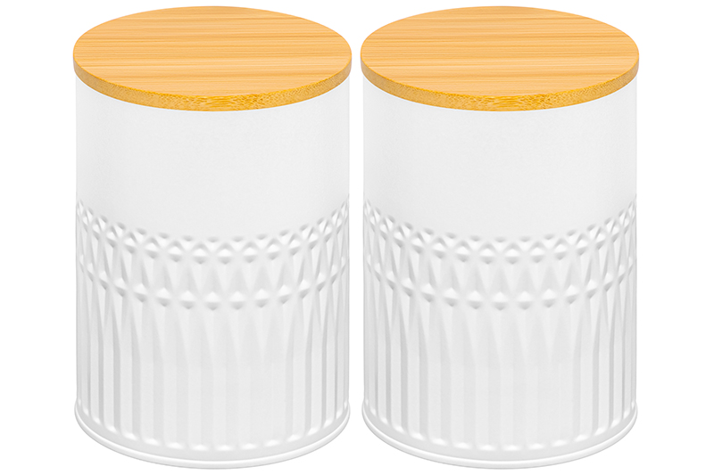 Набор 2 банок для сыпучих продуктов с бамбуковыми крышками от бренда Elan Gallery по 1,2 литра (каждая) станет удобным и эстетичным дополнением вашей кухни. Размер каждого изделия – 11х11х15,8 см, высота каждой банки без крышки – 15 см. Круглые ёмкости белого цвета выполнены из металла и плотно закрываются бамбуковыми крышками благодаря силиконовому уплотнителю. Ёмкости украшены рельефными узорами, поэтому позволят красиво хранить продукты на полке или в шкафу. Помогут хранить соль, специи, приправы, а также любые сладости. Благодаря стильному дизайну подходят для эстетичного хранения на столе, а также для сервировки печенья, мармелада или конфет. Комплект двух металлических контейнеров позволит не просто хранить чай, кофе и сахар на вашей кухне, но и станет элементом её декора. Кухонные баночки для сыпучих продуктов подойдут к интерьеру в любом стиле, от скандинавского до лофт. Не рекомендуется применять абразивные моющие средства. Нельзя использовать в микроволновой печи и посудомоечной машине. Бамбук нельзя замачивать. Поставляются в стильной картонной коробке. Набор посуды из 2 предметов станет украшением кухни или приятным подарком на любой праздник. Благодаря красочной коробочке не потребуется подарочная упаковка. В коллекции бренда Элан Галерея представлено много кухонных органайзеров, сахарниц, столового инвентаря и других стильных товаров для дома. Выберите вариант на свой вкус.
