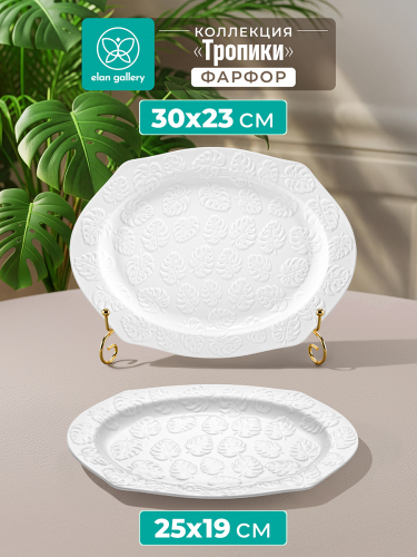 Набор 2 сервировочных фигурных блюд от бренда Elan Gallery "Тропики" выполнен из белого фарфора. В комплект входят тарелки размерами 25,5х19х2 и 30,5х23х2 см. Фарфоровые изделия украшены рельефным узором с тропическими листьями. Благодаря необычной форме тарелочки позволят создать оригинальную сервировку любых закусок, особенно интересно будут выглядеть на них суши и роллы. Выложите на блюда мясную, сырную и рыбную нарезку. Добавьте сочных овощей и свежей зелени, чтобы создать аппетитную композицию. Разнообразие размеров изделий в комплекте позволит подобрать нужный вариант под определённое угощение. Положите на тарелочки сыр, колбасу и кусочки овощей и фруктов, чтобы порадовать гостей на празднике или вечеринке. Можно использовать как сервировочные подставки для подачи кексов и любой выпечки и десертов. Возьмите с собой на дачу, чтобы сервировать на тарелке кусочки шашлыка со свежей зеленью и соленьями. Не рекомендуется применять абразивные моющие средства. Избегать резких перепадов температур и механических повреждений. Можно использовать в микроволновой печи и мыть в посудомоечной машине. Декоративные блюда поставляются в стильной картонной коробке с логотипом бренда. Благодаря ей вам не понадобится дополнительная подарочная упаковка. Комплект станет приятным подарком для тех, кто ценит стильную и эстетичную сервировку. Подарите красивый кухонный инвентарь своим близким на любой праздник. Набор от Elan Gallery "Тропики" добавит вашей сервировке природного очарования в самой изящной форме и позволит собрать сервиз в едином стиле.