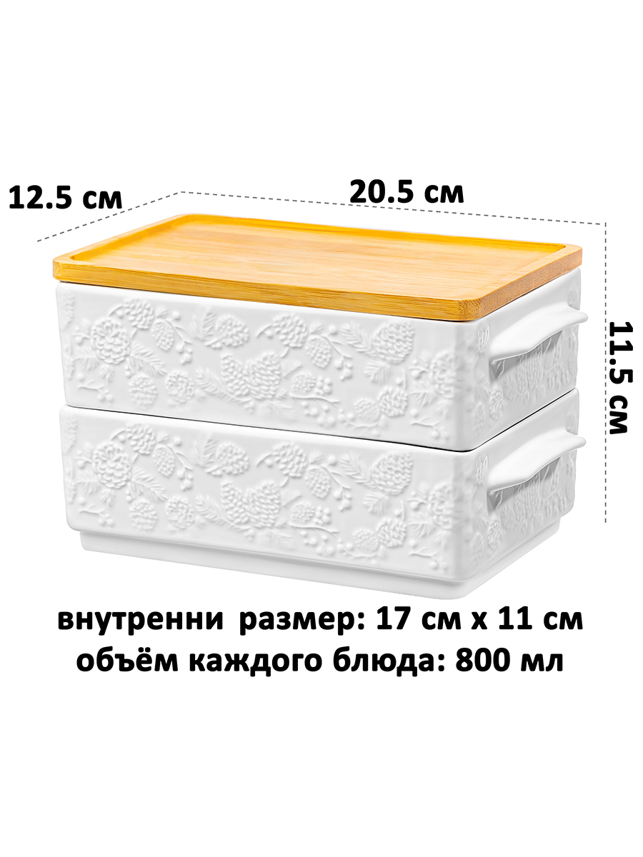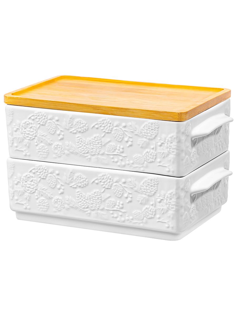 Набор Elan Gallery "Шишки" состоит из 2 прямоугольных блюд для холодца по 800 мл с бамбуковой крышкой (подставкой). Общий размер набора 20,5х12,5х11,5 см, размер каждого блюда без крышки 20,5х11,5х5,6 см. Формы выполнены из фарфора. Можно хранить друг на друге: верхнее будет крышкой для нижнего. Внутренний размер каждого – 17х11 см. "Шишки" – это коллекция фарфоровой посуды, вдохновлённая атмосферой хвойного леса. Белоснежная поверхность изделий украшена утончённым рельефом веточек и шишек. Мы создали коллекцию новогодних и рождественских товаров для сервировки и декора, которые наполнят пространство атмосферой уюта. Изделия помогут оформить интерьер праздничными композициями и добавят нотку зимнего волшебства. Подойдут для подачи сельди под шубой, салатов или плова. Селёдка под шубой – популярное блюдо на праздничном столе, используйте в роли шубницы и угостите им близких и гостей. Можно приспособить как салатник или глубокое сервировочное блюдо для закусок из мяса и рыбы. Столовая посуда серии украшена рельефным узором. Удобны для приготовления заливного, а также желе. Станут прекрасным вариантом для сервировки больших брикетов мороженого. Без крышечки подойдут для запекания бисквита и творожных запеканок. Фарфоровые изделия отличаются от керамических повышенной плотностью. Фарфор не впитывает цвет продуктов и не деформируется от влаги, чему может быть подвержена керамика. Не рекомендуется применять абразивные моющие средства. Без крышки можно использовать в посудомоечной машине, нагревать в микроволновке и духовой печи при температуре до 230 градусов. Бамбук нельзя замачивать! Поставляется в стильной картонной коробке. В коллекции бренда Elan Gallery представлены посуда, сувениры и украшения с новогодней символикой. Каждый подберёт оригинальный сюрприз для семьи, друзей и коллег на Новый год и Рождество. Такой подарок наполнит дом семейным теплом и духом праздника!