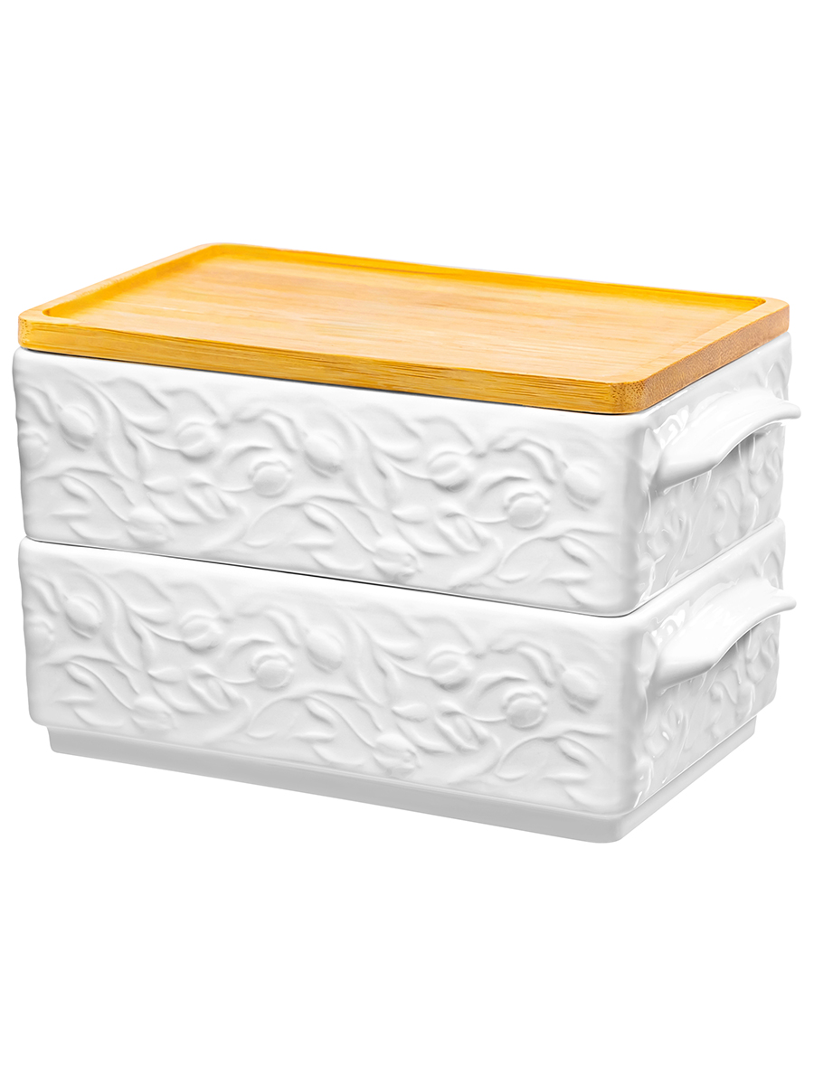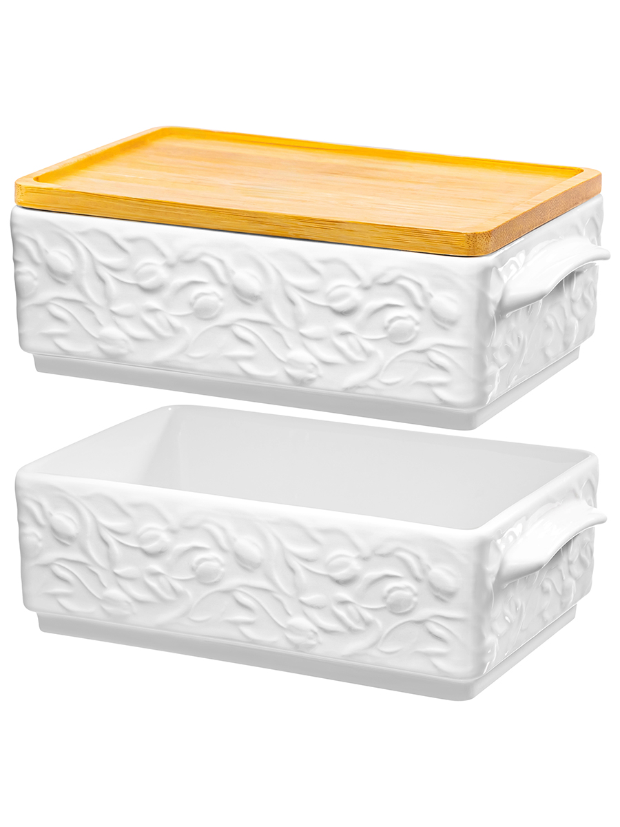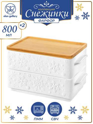 Набор Elan Gallery "Тюльпаны" состоит из 2 прямоугольных блюд для холодца с бамбуковой крышкой (подставкой). Общий размер набора – 20,5х12х12 см, высота конструкции без крышки – 11 см. Размер каждого блюда без крышки – 20,5х11,5х6 см, объём каждого – 800 мл. Внутренний размер каждой ёмкости – 17х10,5 см. Формы выполнены из фарфора. Можно хранить друг на друге: верхнее блюдо будет крышкой для нижнего. Благодаря классическому дизайну и изящному узору станут украшением вашего стола на праздник и в будни! Подойдут для подачи сельди под шубой, салатов или плова. Селёдка под шубой – популярное блюдо на праздничном столе, используйте в роли шубницы и угостите им близких и гостей. Можно приспособить как салатник или глубокое сервировочное блюдо для закусок из мяса и рыбы. Столовая посуда серии украшена рельефным узором. Удобны для приготовления заливного, а также желе. Станут прекрасным вариантом для сервировки больших брикетов мороженого. Без крышечки подойдут для запекания бисквита и творожных запеканок. Фарфоровые изделия отличаются от керамических повышенной плотностью. Фарфор не впитывает цвет продуктов и не деформируется от влаги, чему может быть подвержена керамика. Не рекомендуется применять абразивные моющие средства. Без крышки можно мыть в посудомоечной машине и нагревать в микроволновке и духовке при температуре до 230 градусов. Бамбук нельзя замачивать! Поставляется в картонной коробке. Станет отличным подарком для любой хозяйки, которая ценит стильную сервировку. Благодаря стильной коробочке вам не понадобится дополнительная подарочная упаковка. Особенно понравится любителям посуды в скандинавском стиле! Серия "Тюльпаны" позволит собрать сервиз в едином стиле и сможет стать настоящим украшением вашего дома! В коллекции бренда Elan Gallery представлено много товаров для дома. Выберите красивые тарелки, формы для запекания и любой другой кухонный инвентарь на свой вкус!