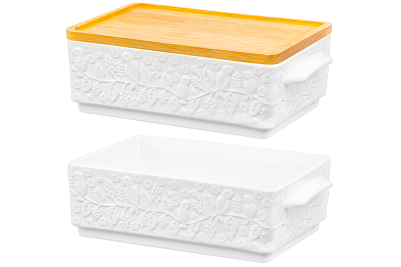 Набор 2 блюд для холодца из серии «Птички на ветке» предназначен для эстетичной сервировки стола. Размер каждого изделия – 20,5х12х6 см, объём – 800 мл. Выполнены из высококачественного белого фарфора, крышка выполнена из натурального бамбука. Фарфор не впитывает цвет продуктов и легко отмывается, благодаря чему надолго сохраняет свою белизну. Поверхность изделий украшает рельефный узор в виде лиственных веточек, на которых расположились маленькие птички. Вместительные контейнеры подойдут для подачи сельди под шубой, салатов или плова, чтобы порадовать себя или гостей за праздничным столом. Используйте в качестве салатников или глубоких сервировочных блюд для эстетичной подачи закусок из мяса и рыбы. Такая посуда удобна для приготовления заливного, а также желе. Заполните каждое блюдо щедрой порцией мороженого, чтобы угостить большую компанию. Компактно храните штабелируемые блюда друг на друге. Лаконичный дизайн впишет их в интерьер любой кухни, гостиной или столовой. Без крышки подойдут для приготовления бисквита и творожных запеканок. Не рекомендуется применять абразивные моющие средства. Без крышки можно использовать в посудомоечной машине, микроволновой печи и духовом шкафу при температуре до 230 градусов. Бамбук нельзя замачивать! Поставляется в дизайнерской картонной коробке – благодаря ей вам не потребуется дополнительная подарочная упаковка. Фарфоровая сервировочная посуда станет оригинальным подарком для хозяйки, ценящей не только практичность, но и привлекательность. Серия «Птички на ветке» станет украшением любого кухонного инвентаря и позволит собрать красивый сервиз в едином стиле!