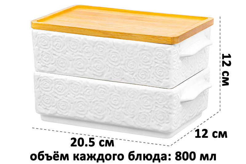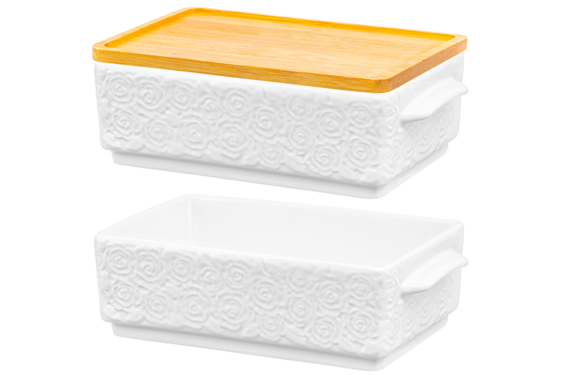 Набор 2 блюд для холодца из серии «Розы» предназначен для эстетичной сервировки стола. Размер каждого изделия – 20,5х12х6 см, объём – 800 мл. Выполнены из высококачественного белого фарфора, крышка выполнена из натурального бамбука. Фарфор не впитывает цвет продуктов и легко отмывается, благодаря чему надолго сохраняет свою белизну. Поверхность изделий украшают рельефные узоры в виде бутонов роз. Вместительные контейнеры подойдут для подачи сельди под шубой, салатов или плова, чтобы порадовать себя или гостей за праздничным столом. Используйте в качестве салатников или глубоких сервировочных блюд для эстетичной подачи закусок из мяса и рыбы. Такая посуда удобна для приготовления заливного, а также желе. Заполните каждое блюдо щедрой порцией мороженого, чтобы угостить большую компанию. Компактно храните штабелируемые блюда друг на друге. Лаконичный дизайн впишет их в интерьер любой кухни, гостиной или столовой. Без крышки подойдут для приготовления бисквита и творожных запеканок. Не рекомендуется применять абразивные моющие средства. Без крышки можно использовать в посудомоечной машине, микроволновой печи и духовом шкафу при температуре до 230 градусов. Бамбук нельзя замачивать! Поставляется в дизайнерской картонной коробке – благодаря ей вам не потребуется дополнительная подарочная упаковка. Фарфоровая сервировочная посуда станет оригинальным подарком для хозяйки, ценящей не только практичность, но и привлекательность. Серия «Розы» станет украшением любого кухонного инвентаря и позволит собрать красивый сервиз в едином стиле!
